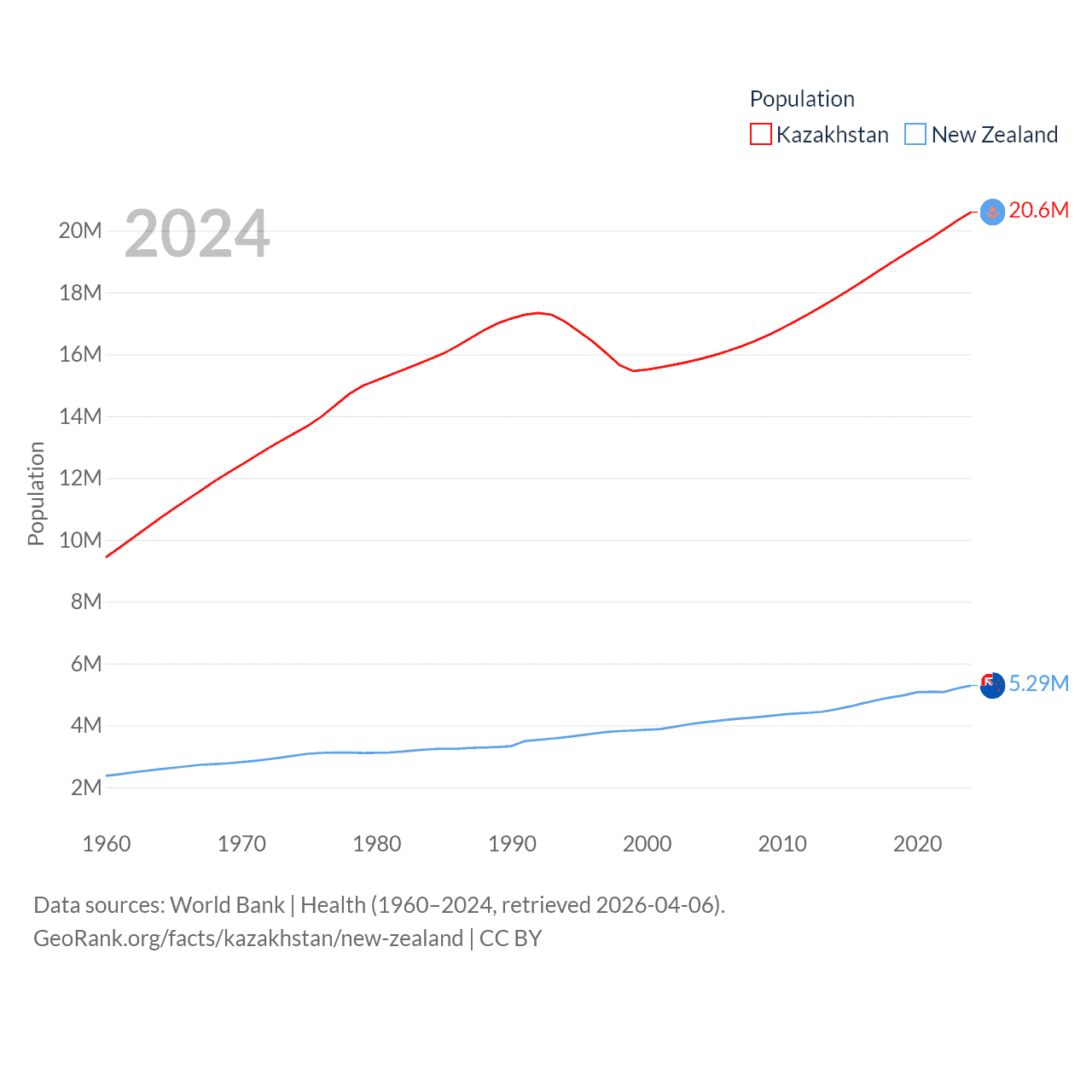 Kazakhstan has a population of 20.6M (ranked 64/197), compared with 5.29M in New Zealand (ranked 123/197). Kazakhstan's land area is 1,042,360 sq mi versus 101,665 sq mi for New Zealand (ranked 9th vs. 74th).
