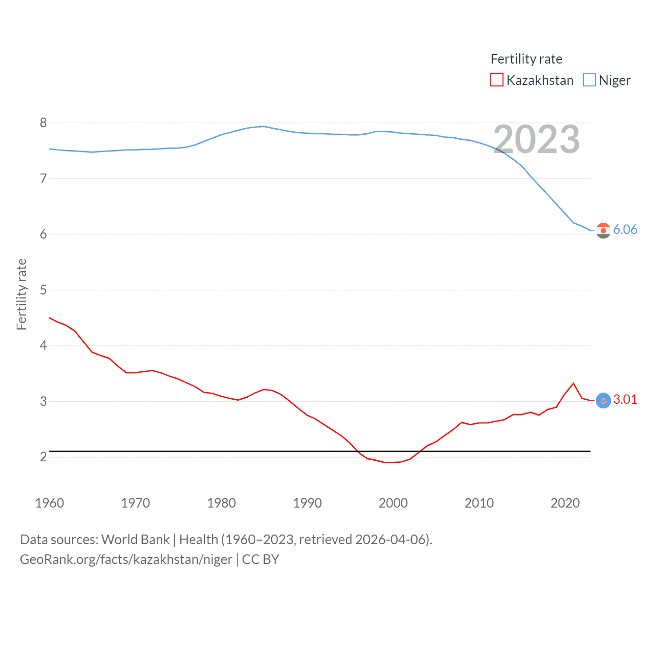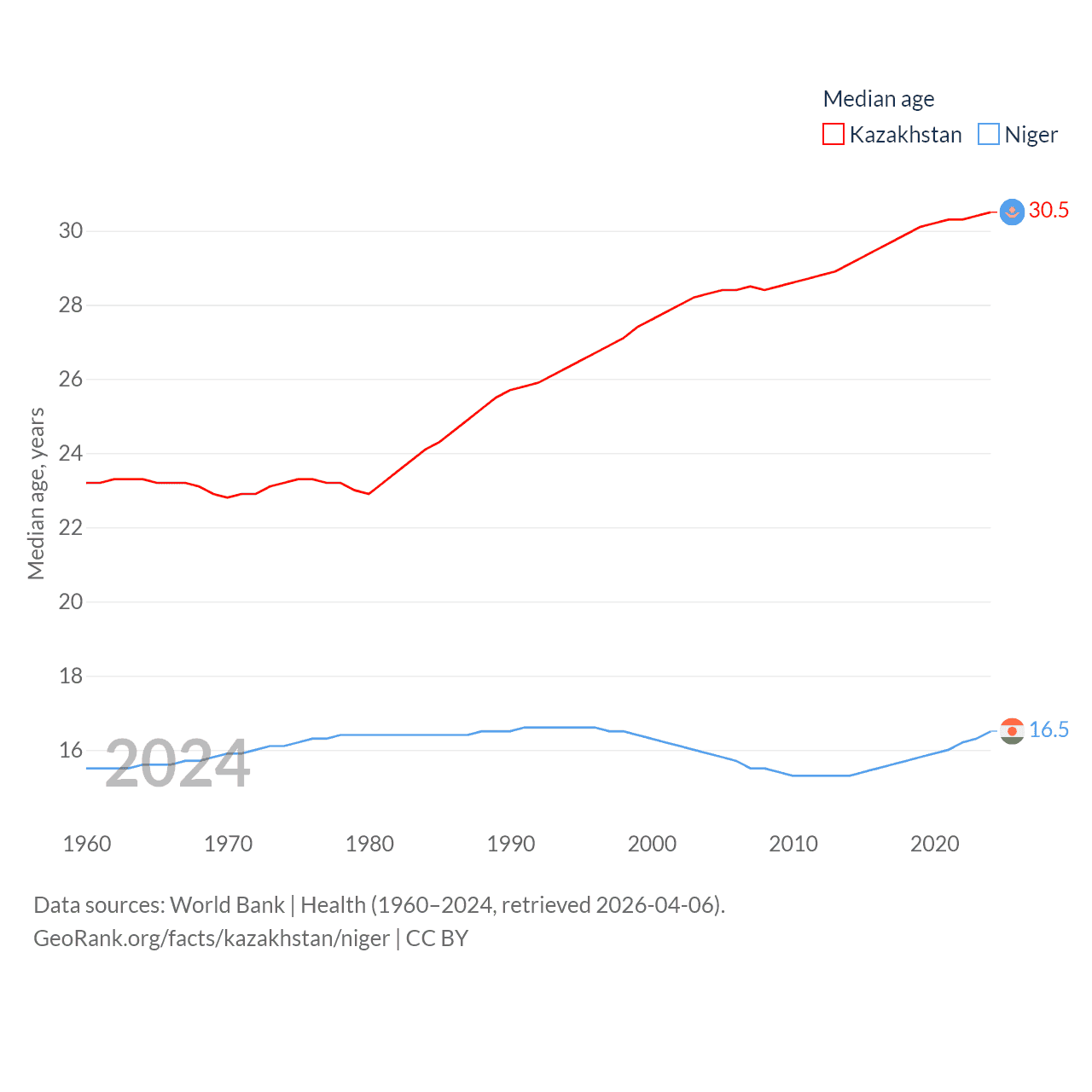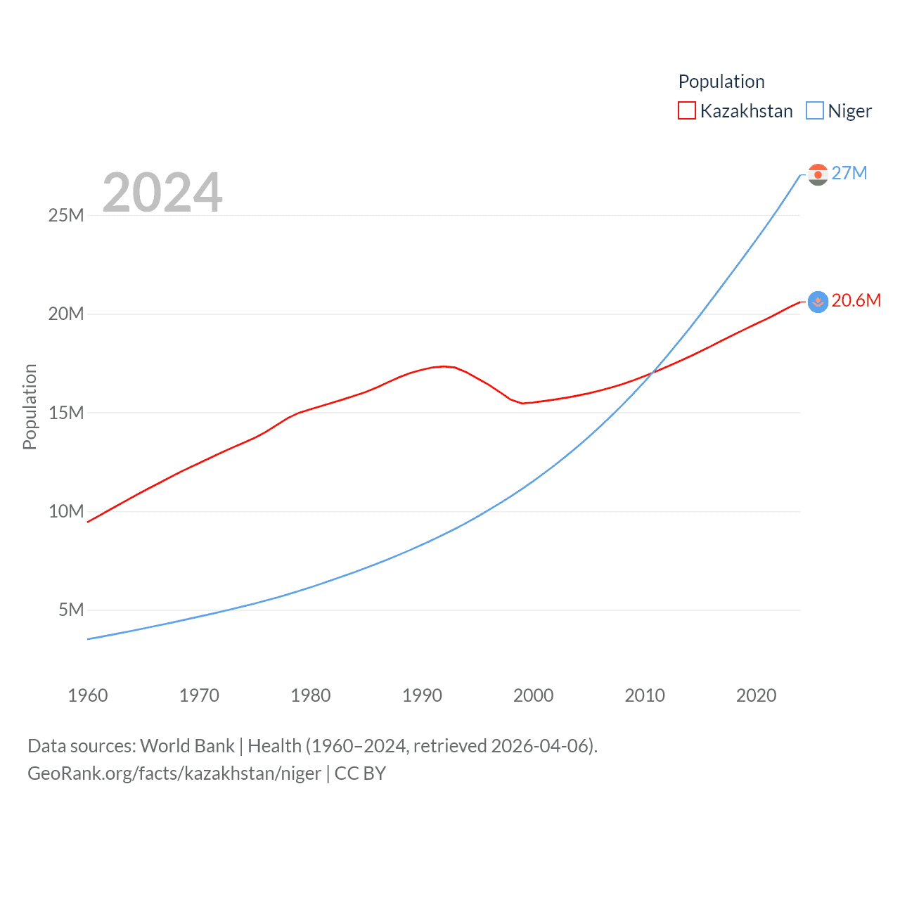 Kazakhstan has a population of 20.6M (ranked 64/197), compared with 27M in Niger (ranked 55/197). Kazakhstan's land area is 1,042,360 sq mi versus 489,076 sq mi for Niger (ranked 9th vs. 20th).