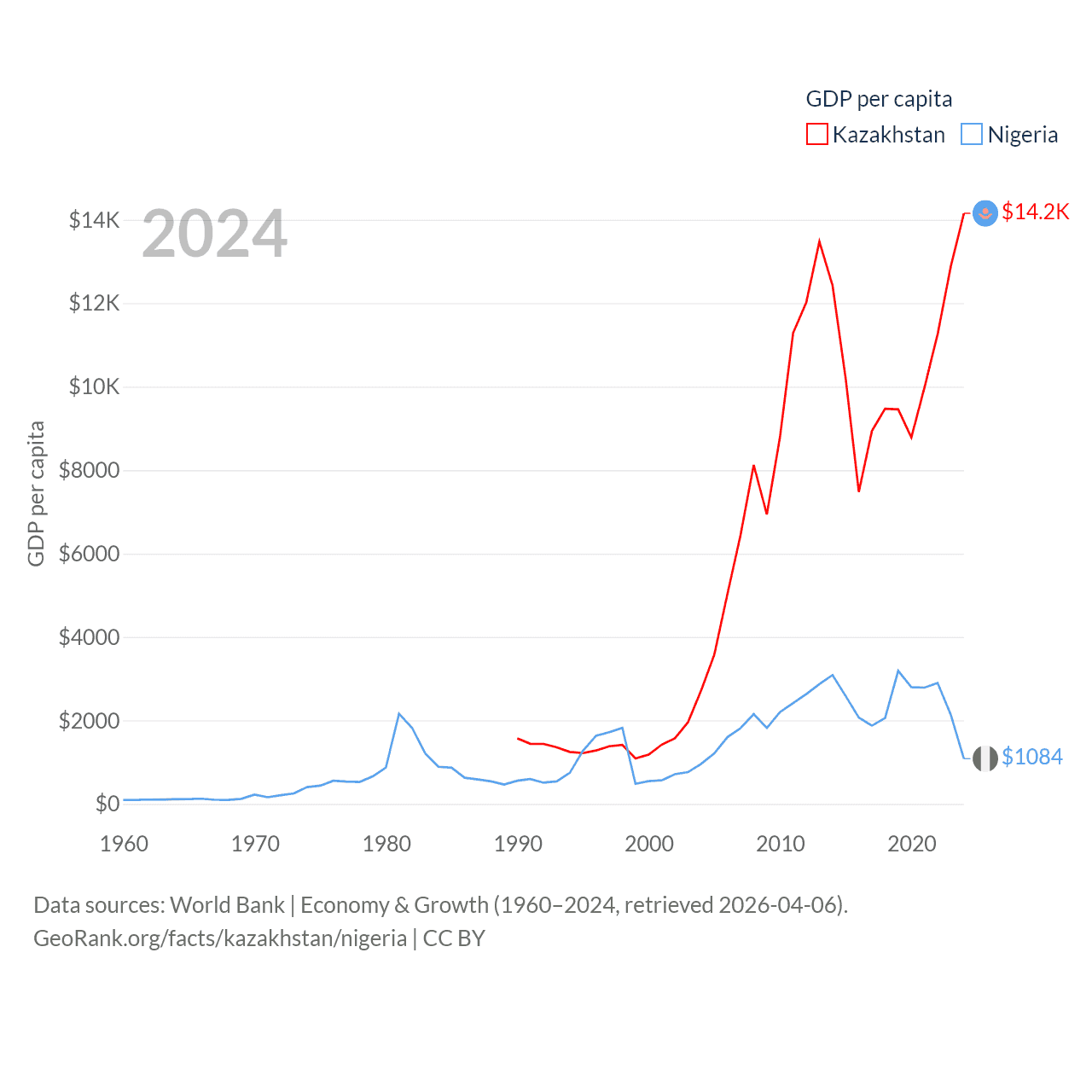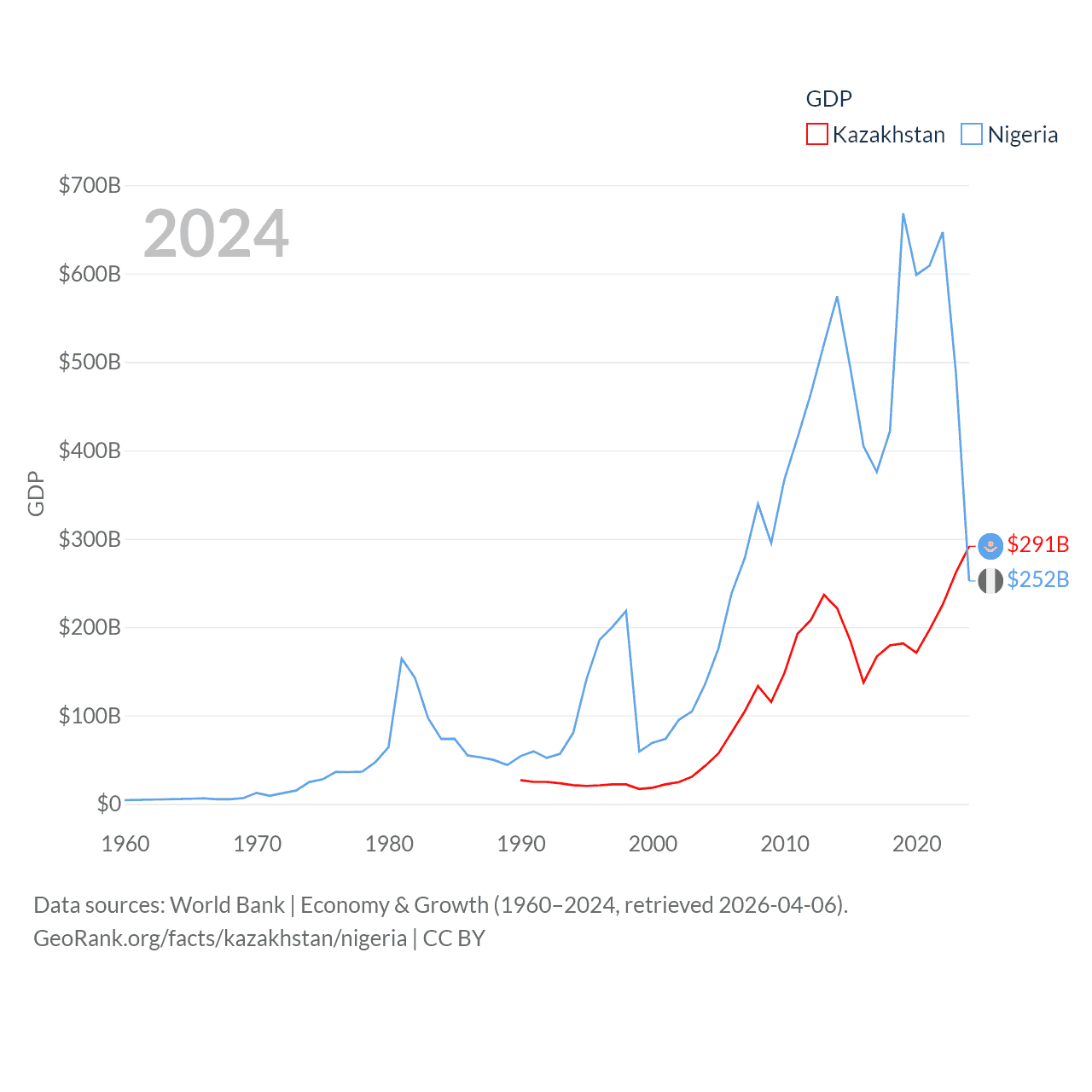 By GDP, Kazakhstan ranks 48/197 ($291B) and Nigeria ranks 54/197 ($252B). By GDP per capita, Kazakhstan ranks 71/197 ($14,155), while Nigeria ranks 174/197 ($1,084).