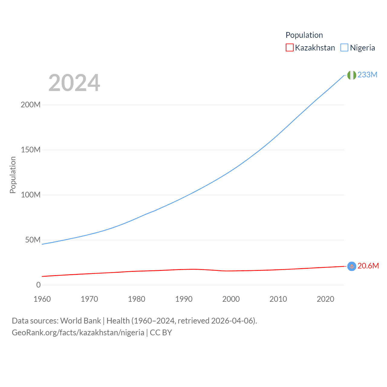 Kazakhstan has a population of 20.6M (ranked 64/197), compared with 233M in Nigeria (ranked 6/197). Kazakhstan's land area is 1,042,360 sq mi versus 351,650 sq mi for Nigeria (ranked 9th vs. 30th).