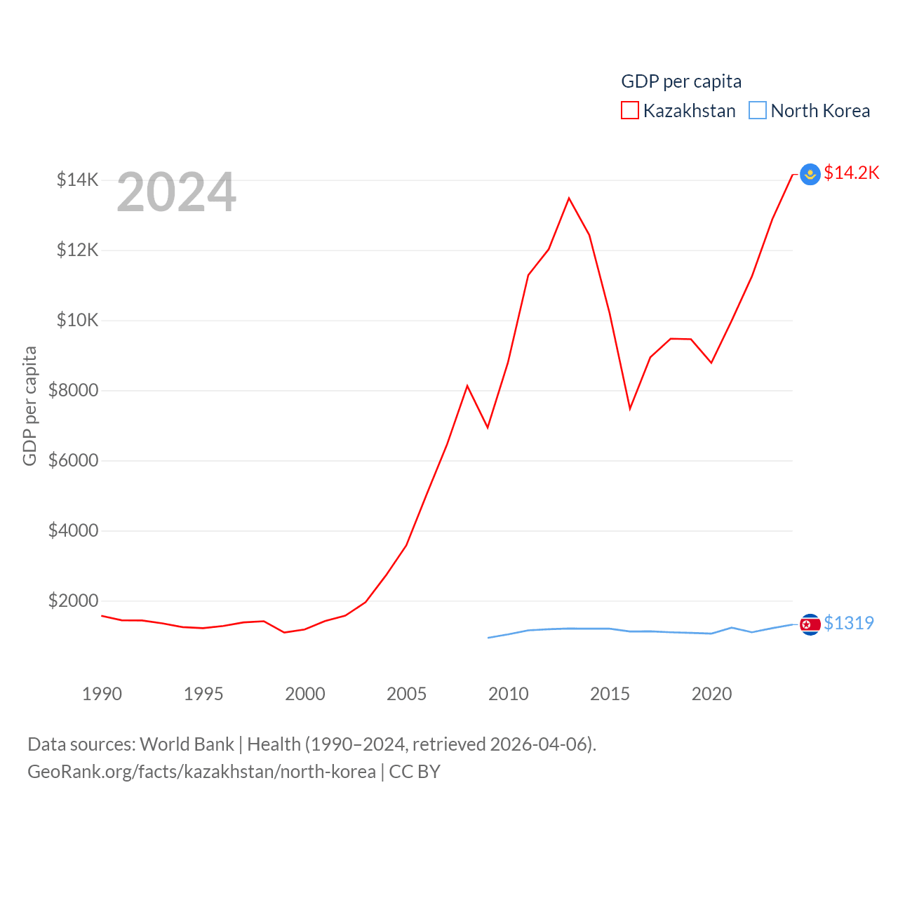 By GDP, Kazakhstan ranks 48/197 ($291B) and North Korea ranks 106/197 ($34.9B). By GDP per capita, Kazakhstan ranks 71/197 ($14,155), while North Korea ranks 168/197 ($1,319).