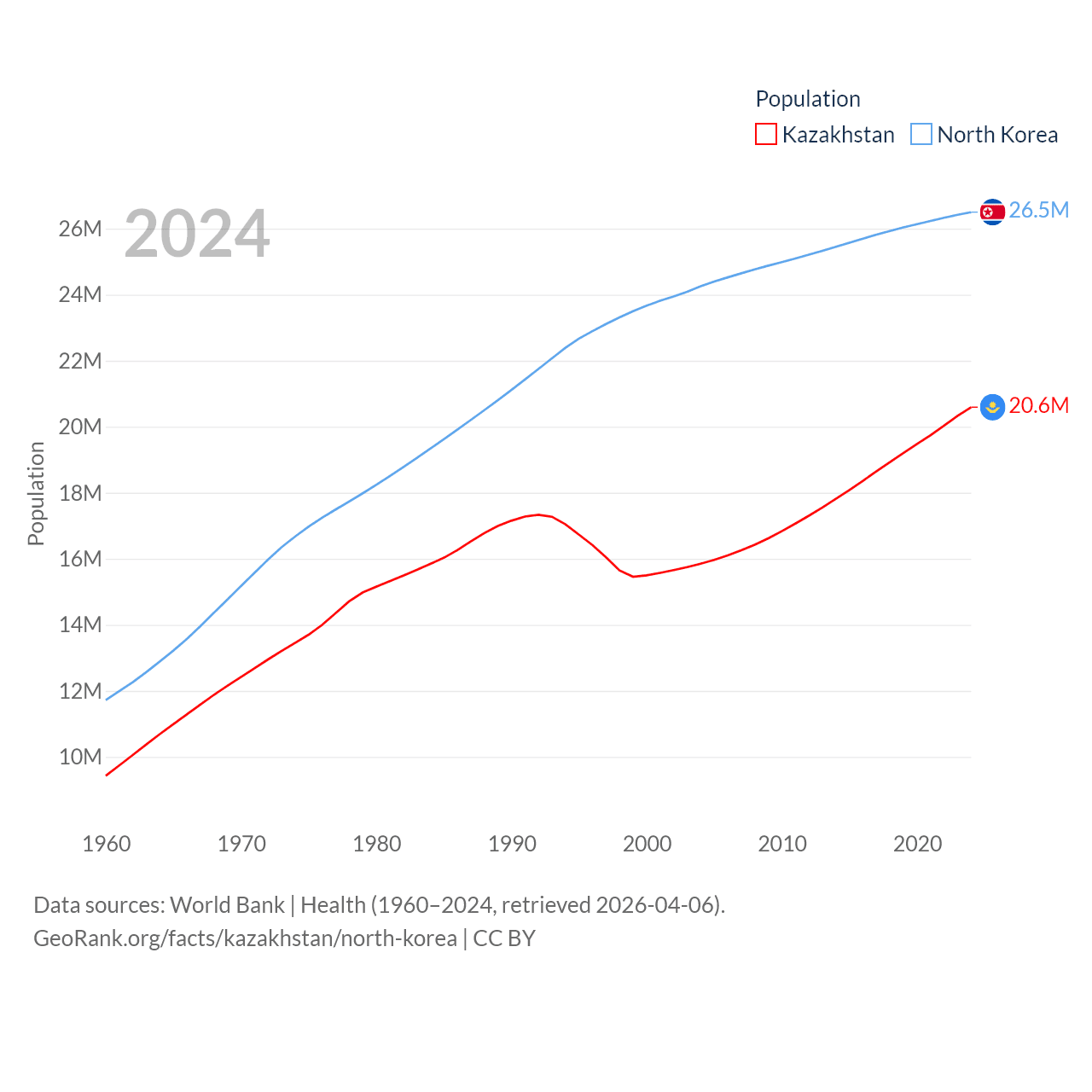 Kazakhstan has a population of 20.6M (ranked 64/197), compared with 26.5M in North Korea (ranked 56/197). Kazakhstan's land area is 1,042,360 sq mi versus 46,491 sq mi for North Korea (ranked 9th vs. 97th).