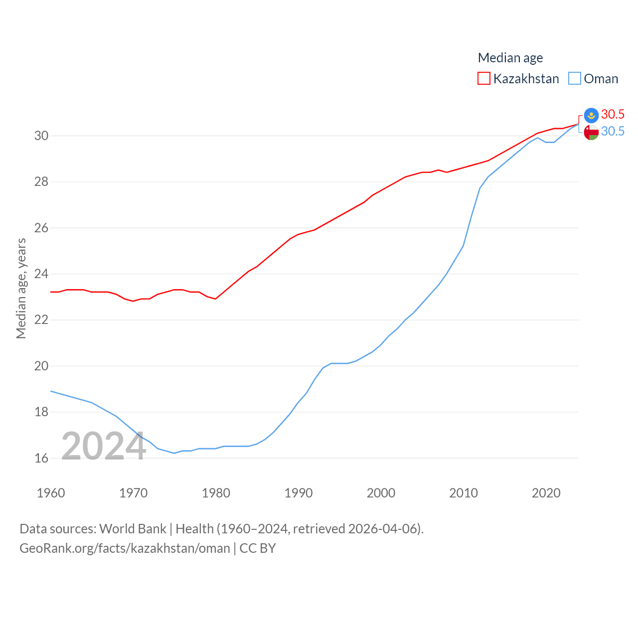 Kazakhstan has a population of 20.6M (ranked 64/197), compared with 5.28M in Oman (ranked 124/197). Kazakhstan's land area is 1,042,360 sq mi versus 119,499 sq mi for Oman (ranked 9th vs. 68th).