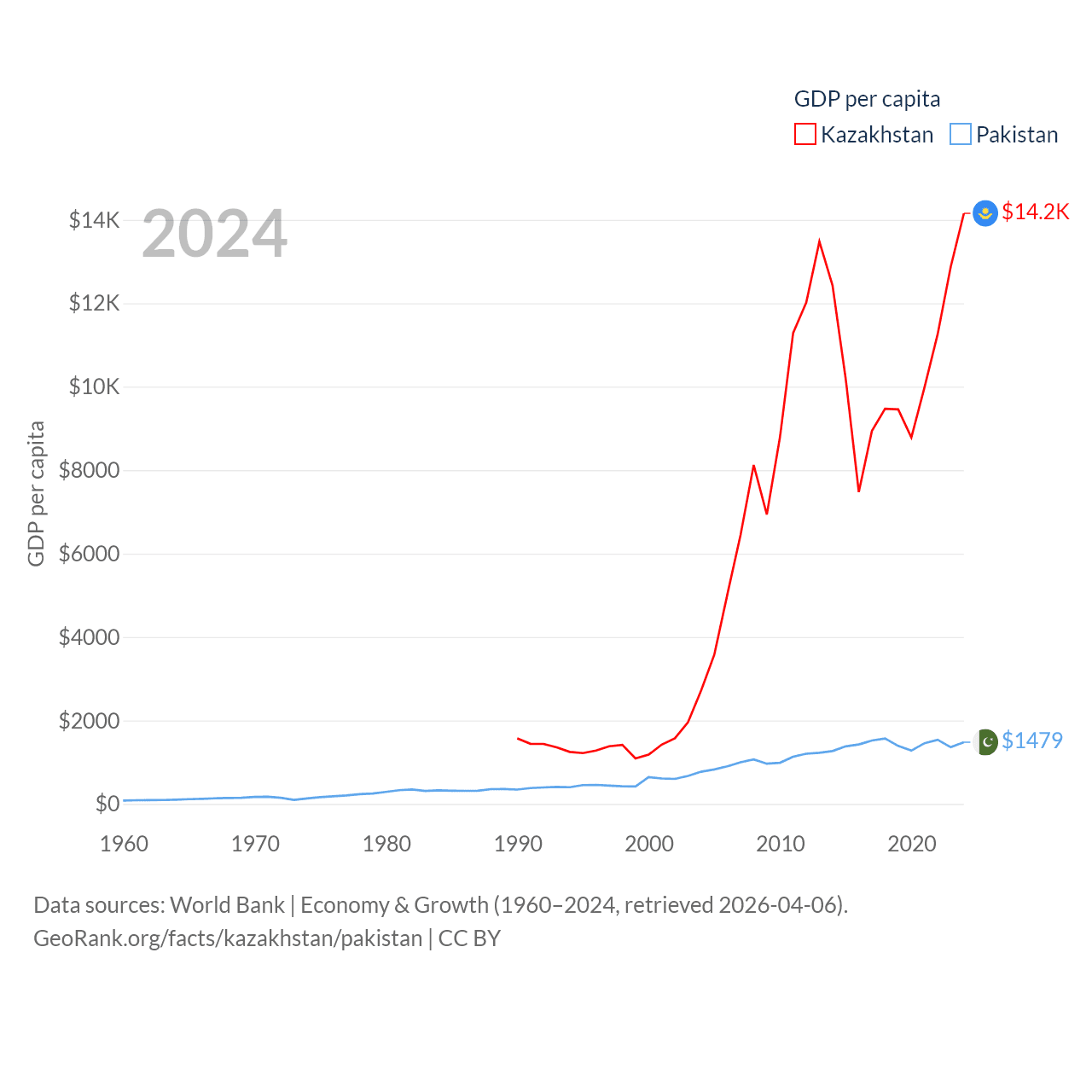 By GDP, Kazakhstan ranks 48/197 ($291B) and Pakistan ranks 43/197 ($372B). By GDP per capita, Kazakhstan ranks 71/197 ($14,155), while Pakistan ranks 163/197 ($1,479).