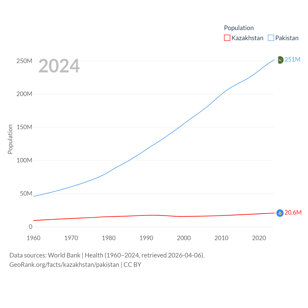 Kazakhstan has a population of 20.6M (ranked 64/197), compared with 251M in Pakistan (ranked 5/197). Kazakhstan's land area is 1,042,360 sq mi versus 297,638 sq mi for Pakistan (ranked 9th vs. 35th).