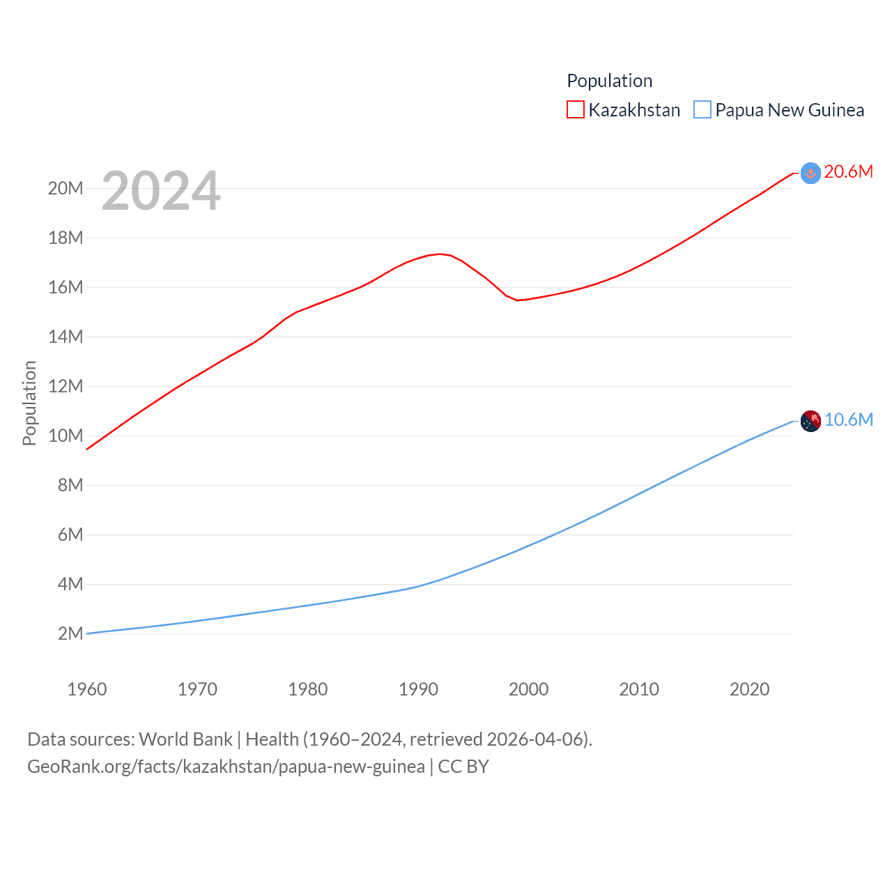 Kazakhstan has a population of 20.6M (ranked 64/197), compared with 10.6M in Papua New Guinea (ranked 92/197). Kazakhstan's land area is 1,042,360 sq mi versus 174,850 sq mi for Papua New Guinea (ranked 9th vs. 54th).
