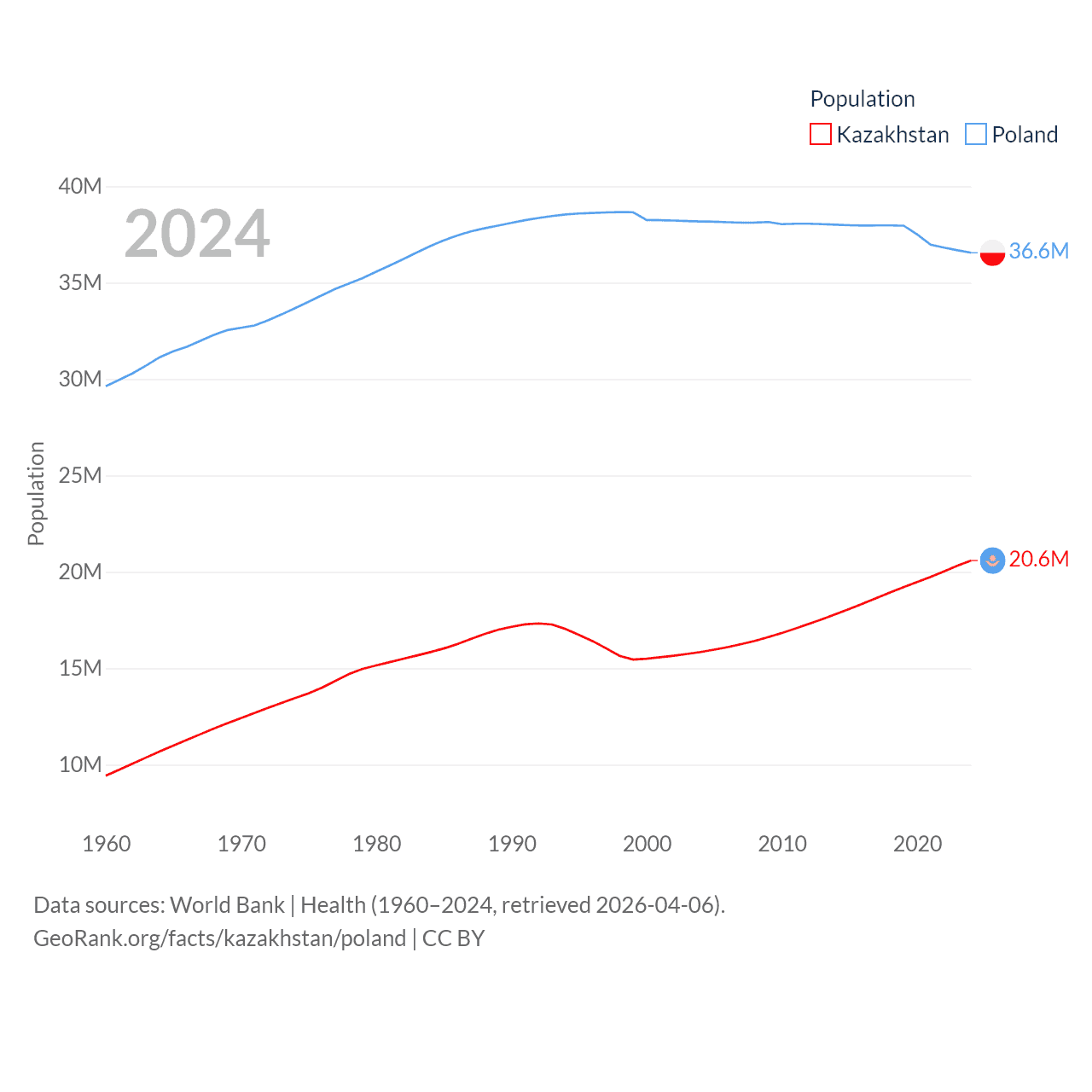 Kazakhstan has a population of 20.6M (ranked 64/197), compared with 36.6M in Poland (ranked 42/197). Kazakhstan's land area is 1,042,360 sq mi versus 118,252 sq mi for Poland (ranked 9th vs. 69th).