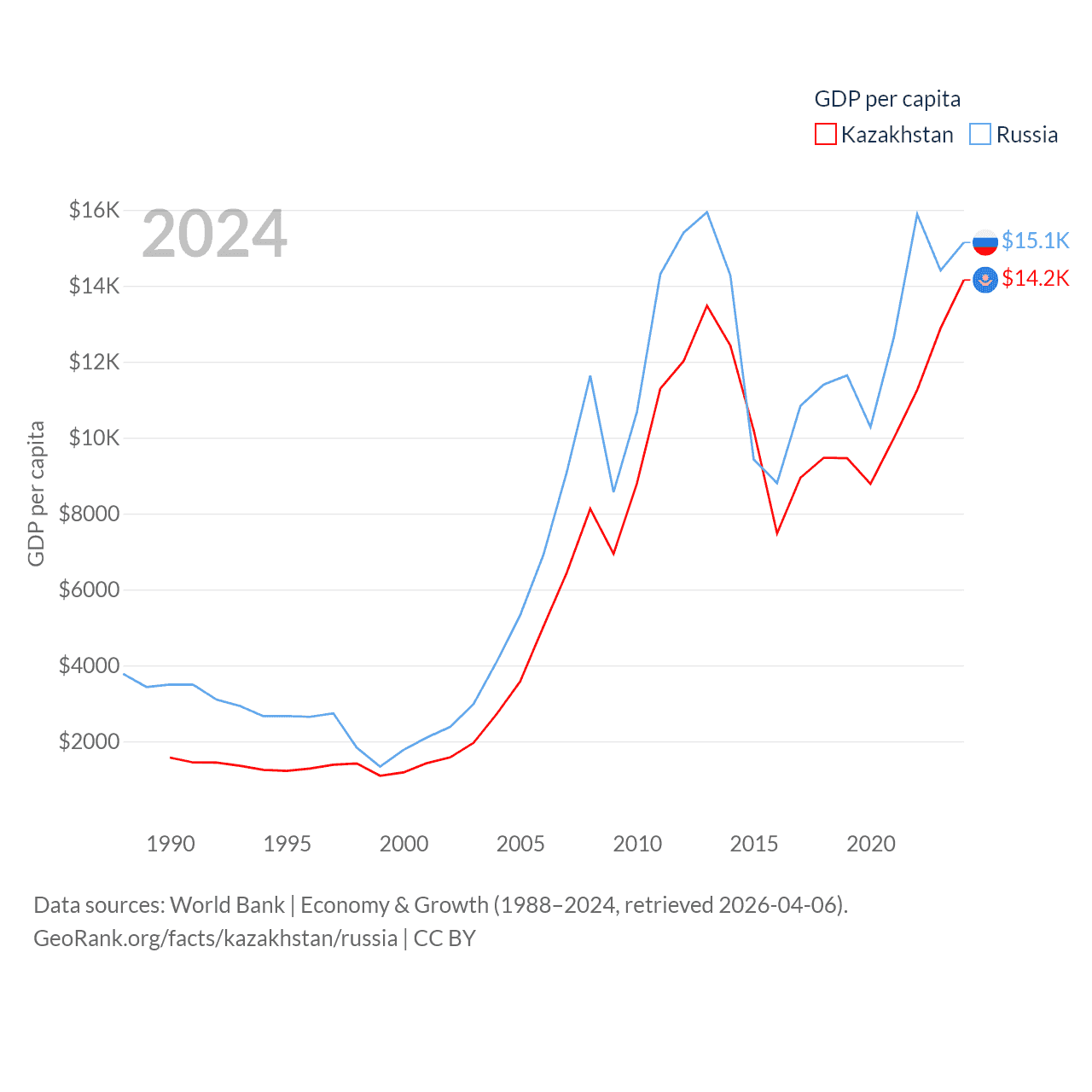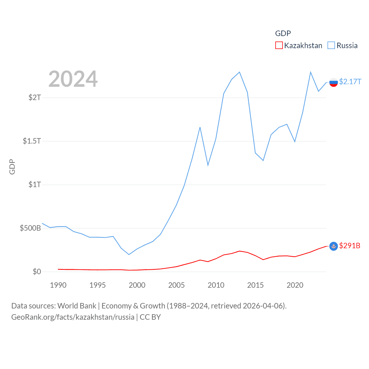 By GDP, Kazakhstan ranks 48/197 ($291B) and Russia ranks 11/197 ($2.17T). By GDP per capita, Kazakhstan ranks 71/197 ($14,155), while Russia ranks 68/197 ($15,145).