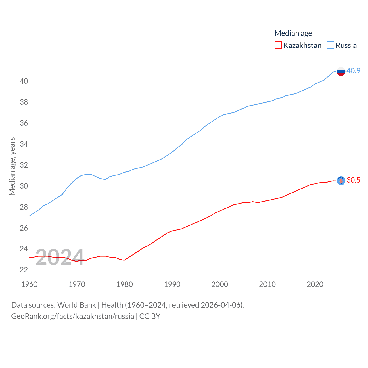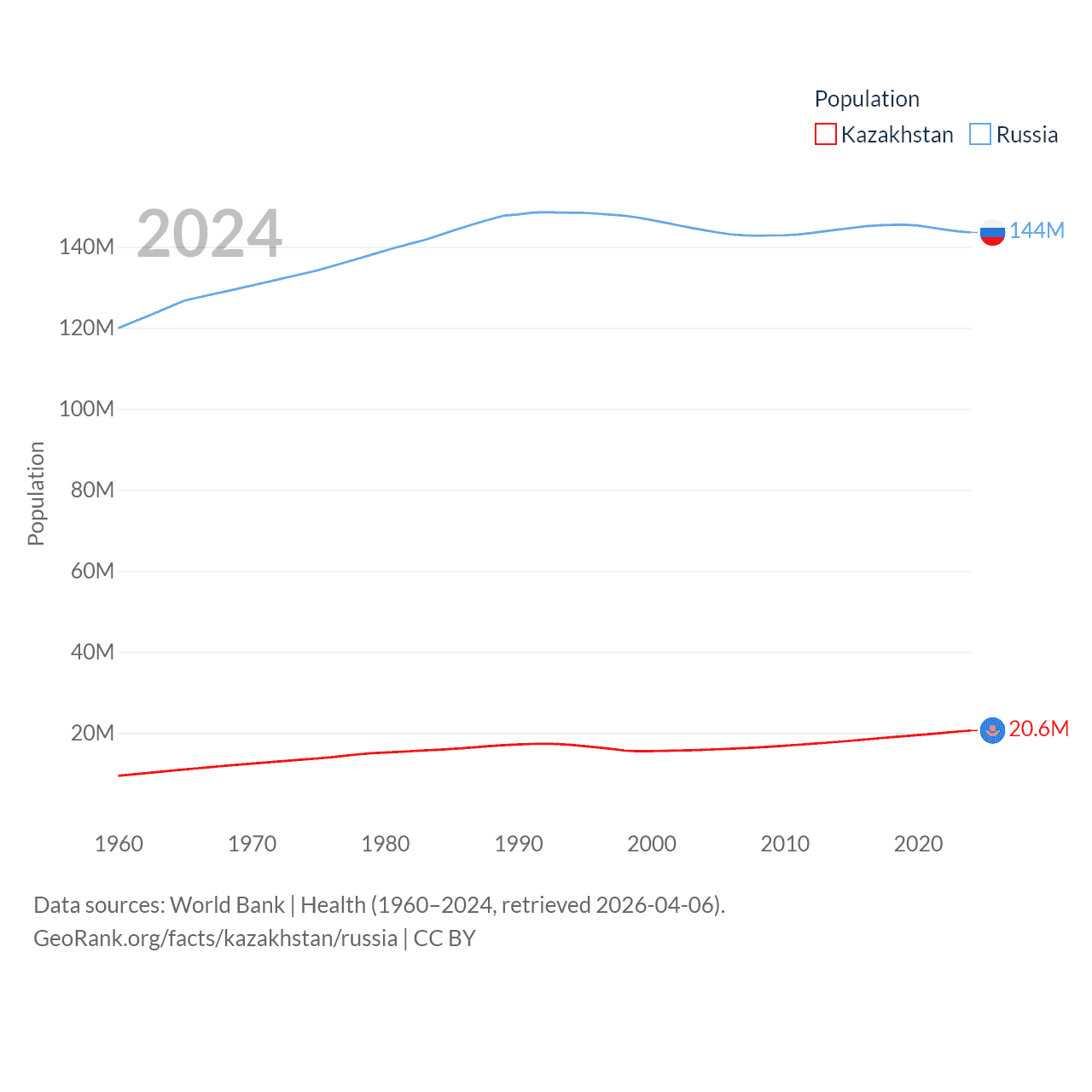 Kazakhstan has a population of 20.6M (ranked 64/197), compared with 144M in Russia (ranked 9/197). Kazakhstan's land area is 1,042,360 sq mi versus 6,323,145 sq mi for Russia (ranked 9th vs. 1st).