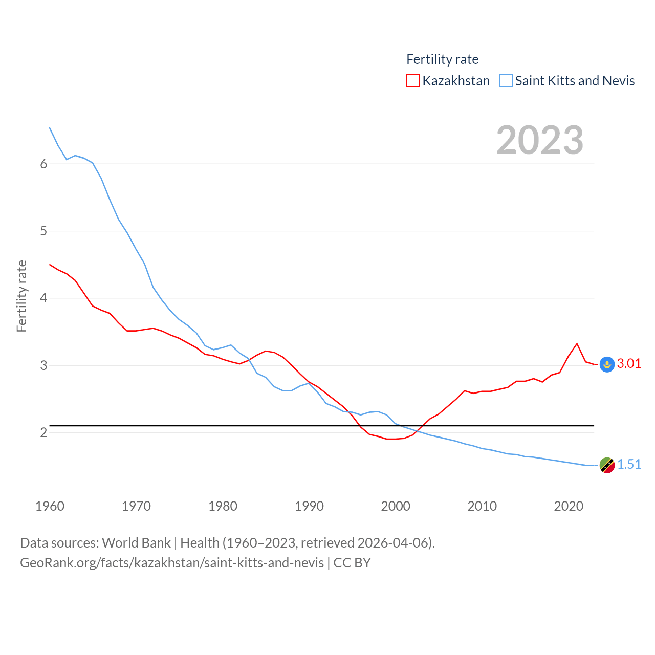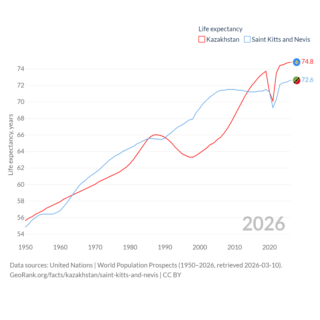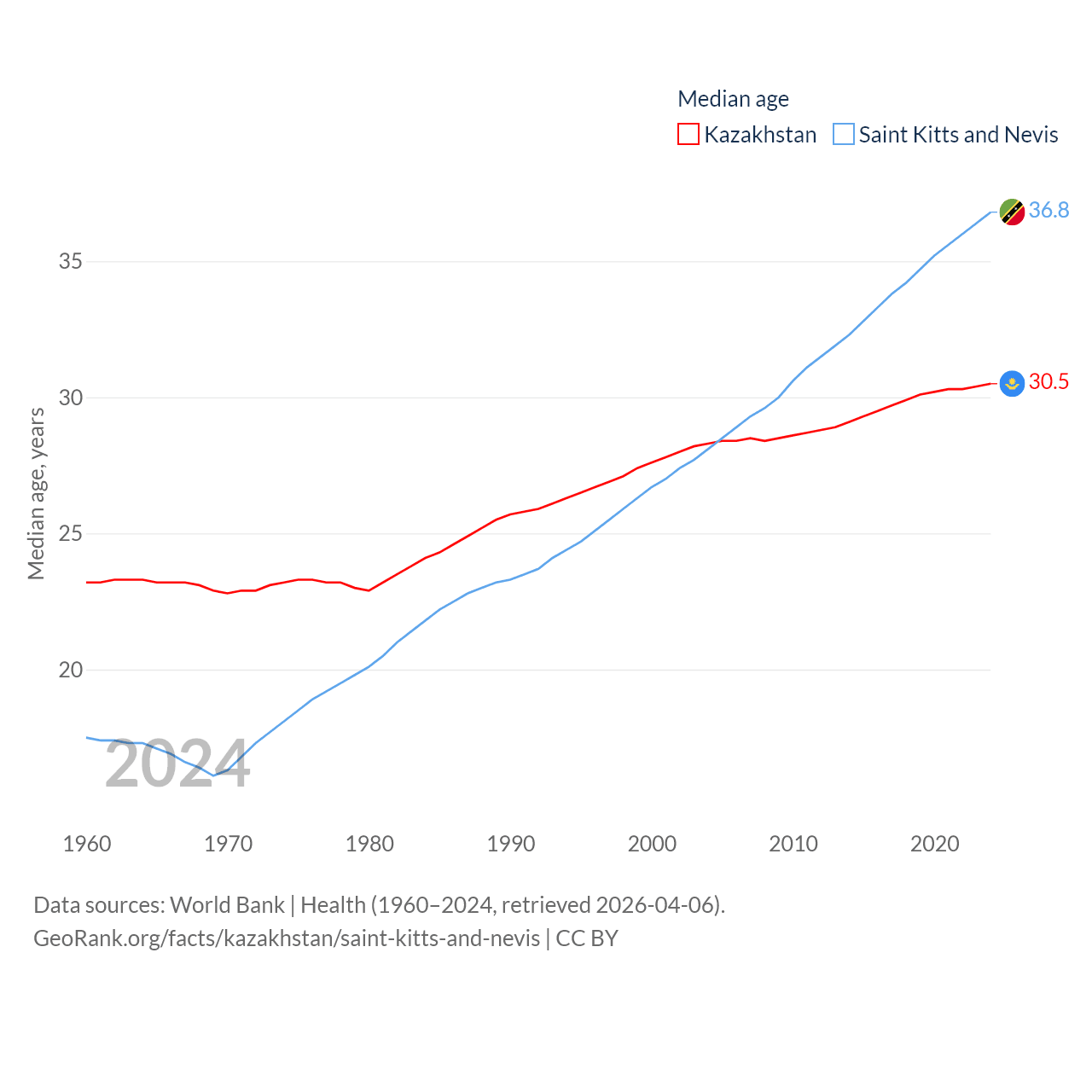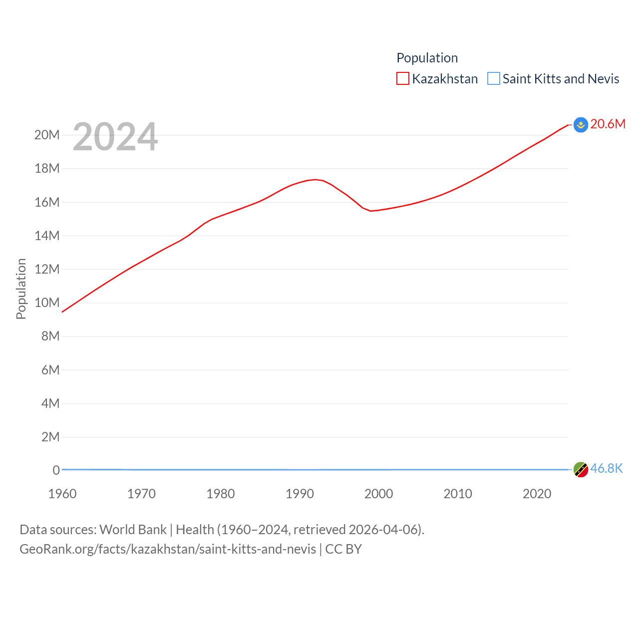 Kazakhstan has a population of 20.6M (ranked 64/197), compared with 46.8K in Saint Kitts and Nevis (ranked 189/197). Kazakhstan's land area is 1,042,360 sq mi versus 100.4 sq mi for Saint Kitts and Nevis (ranked 9th vs. 189th).