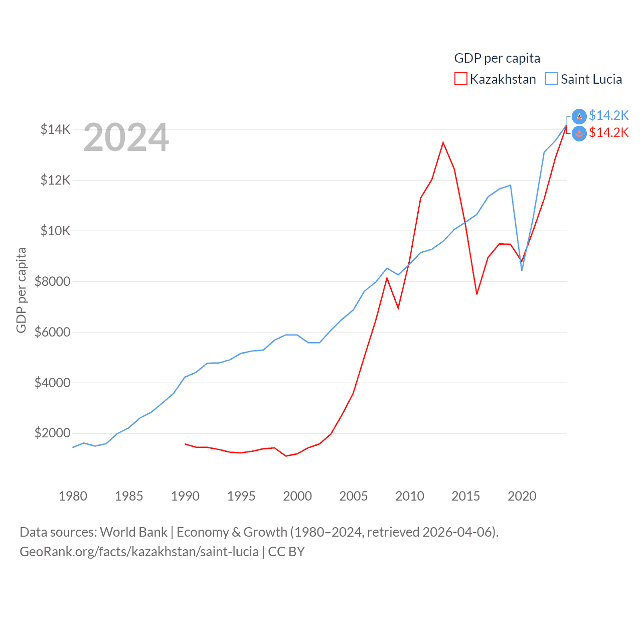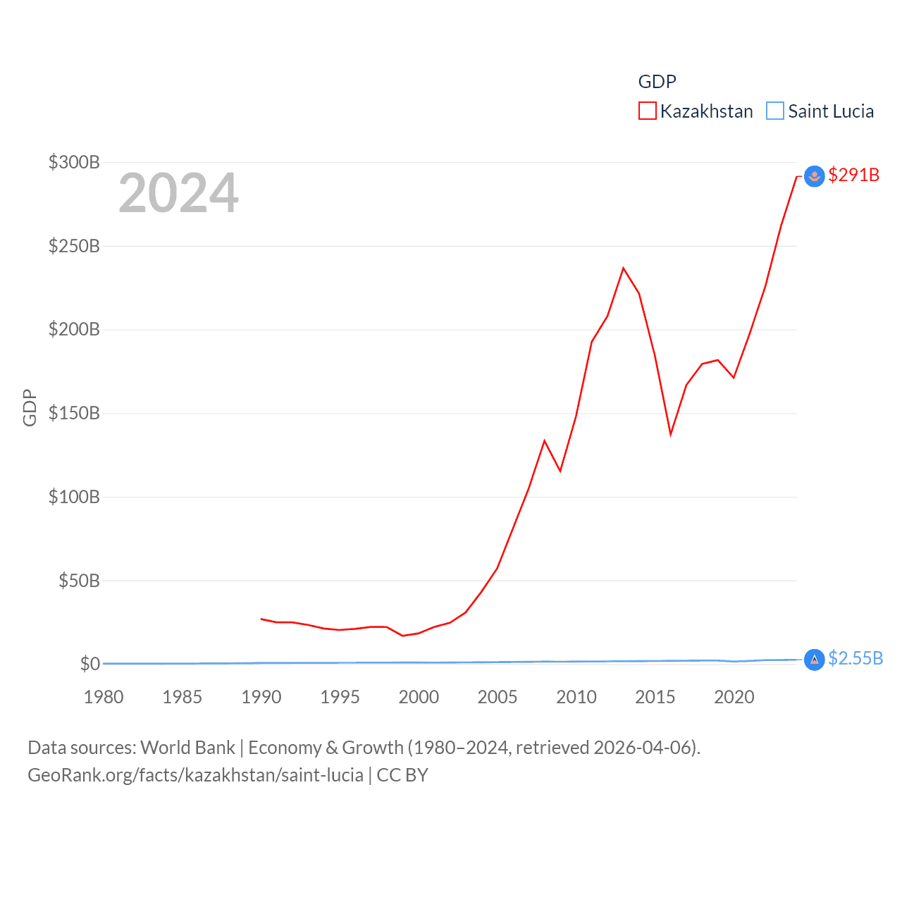 By GDP, Kazakhstan ranks 48/197 ($291B) and Saint Lucia ranks 173/197 ($2.55B). By GDP per capita, Kazakhstan ranks 71/197 ($14,155), while Saint Lucia ranks 70/197 ($14,182).