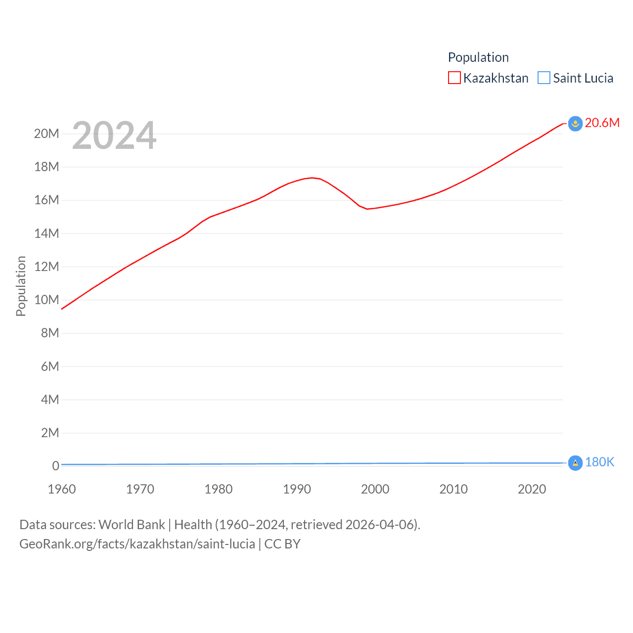 Kazakhstan has a population of 20.6M (ranked 64/197), compared with 180K in Saint Lucia (ranked 178/197). Kazakhstan's land area is 1,042,360 sq mi versus 235.5 sq mi for Saint Lucia (ranked 9th vs. 178th).