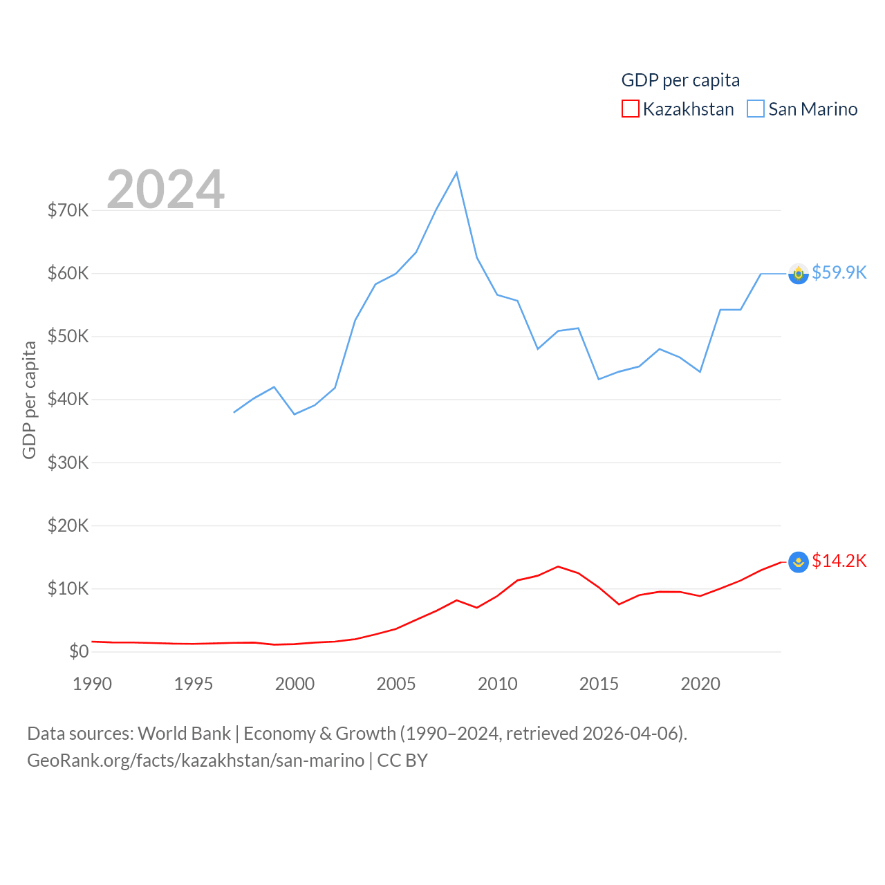 By GDP, Kazakhstan ranks 48/197 ($291B) and San Marino ranks 180/197 ($2.03B). By GDP per capita, Kazakhstan ranks 71/197 ($14,155), while San Marino ranks 15/197 ($59,880).