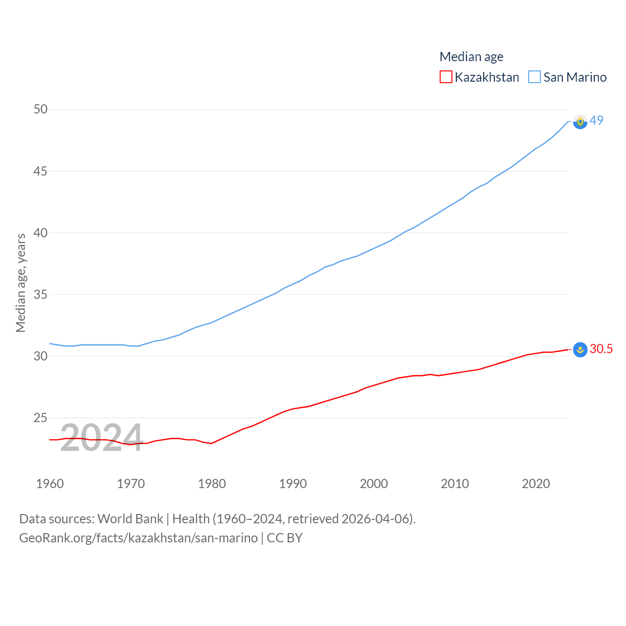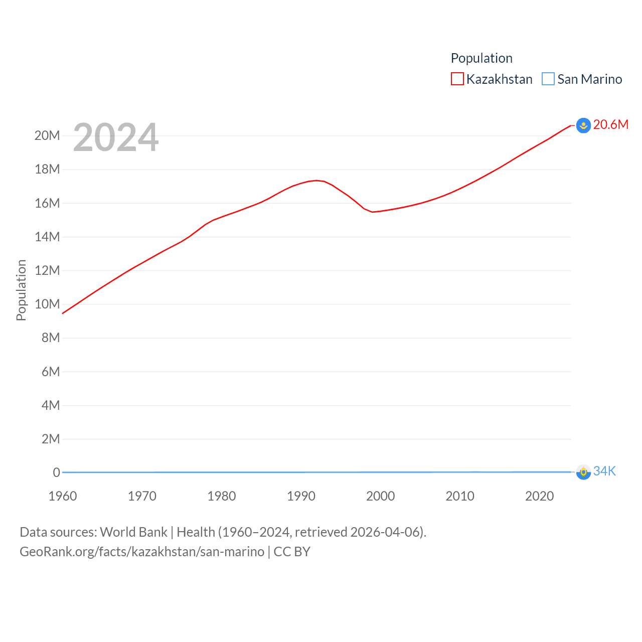 Kazakhstan has a population of 20.6M (ranked 64/197), compared with 34K in San Marino (ranked 193/197). Kazakhstan's land area is 1,042,360 sq mi versus 23.2 sq mi for San Marino (ranked 9th vs. 193rd).