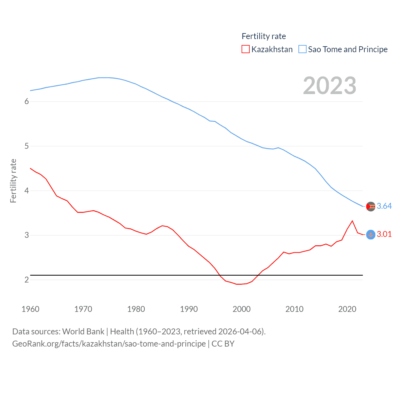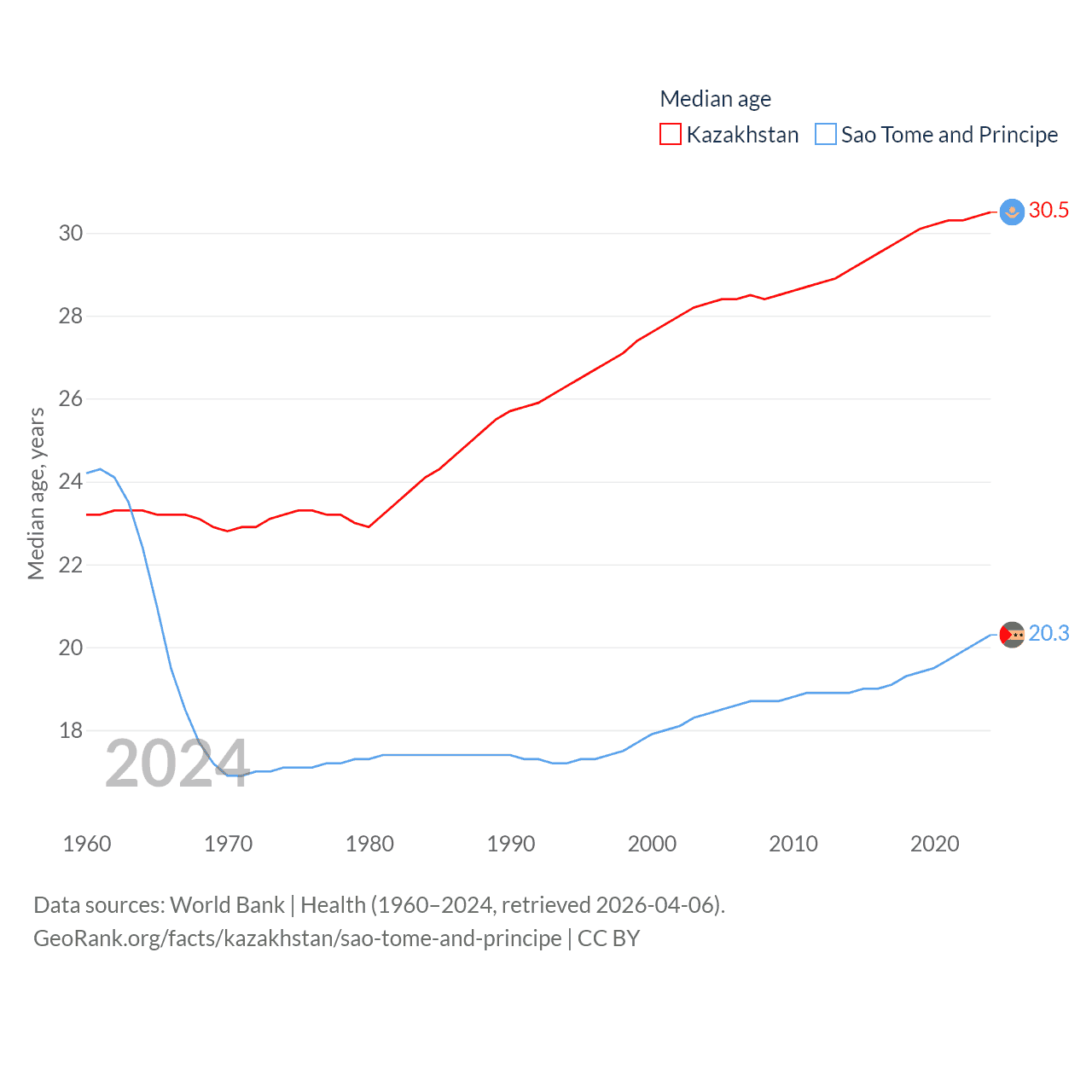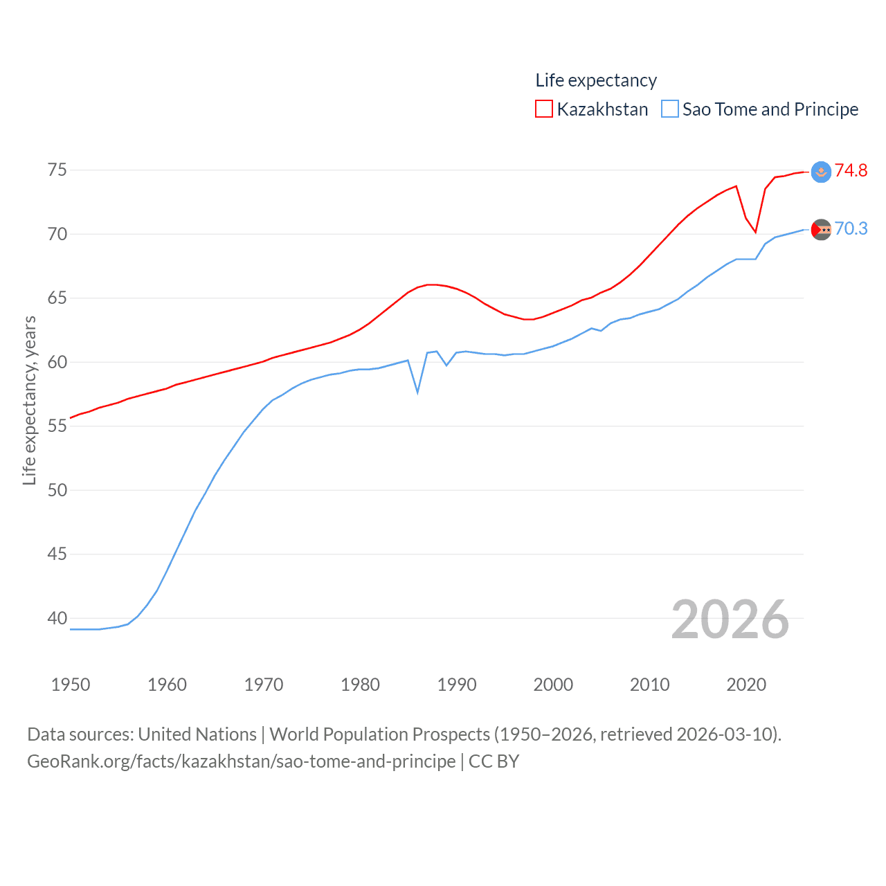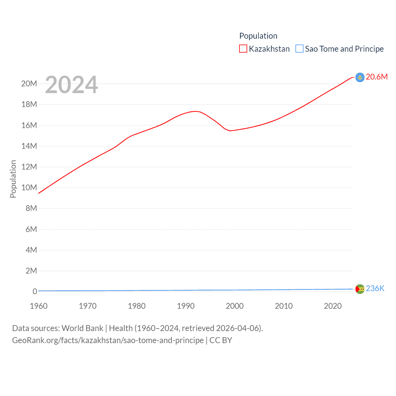 Kazakhstan has a population of 20.6M (ranked 64/197), compared with 236K in Sao Tome and Principe (ranked 176/197). Kazakhstan's land area is 1,042,360 sq mi versus 371 sq mi for Sao Tome and Principe (ranked 9th vs. 172nd).