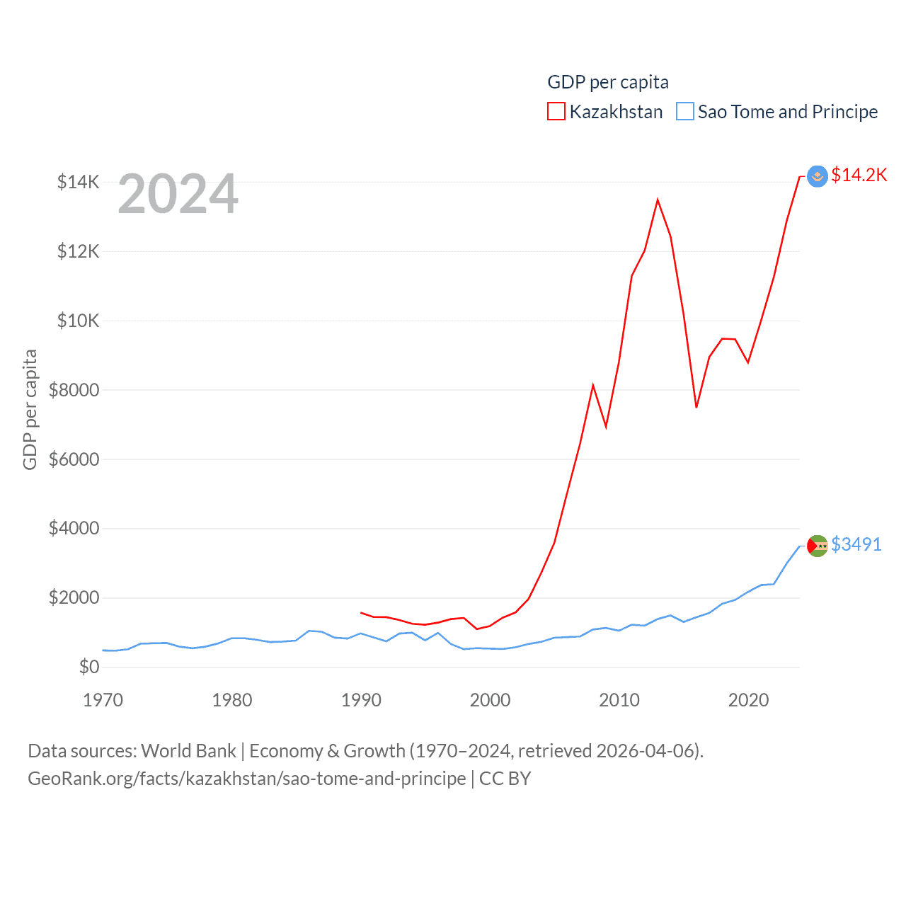 By GDP, Kazakhstan ranks 48/197 ($291B) and Sao Tome and Principe ranks 189/197 ($822M). By GDP per capita, Kazakhstan ranks 71/197 ($14,155), while Sao Tome and Principe ranks 134/197 ($3,491).