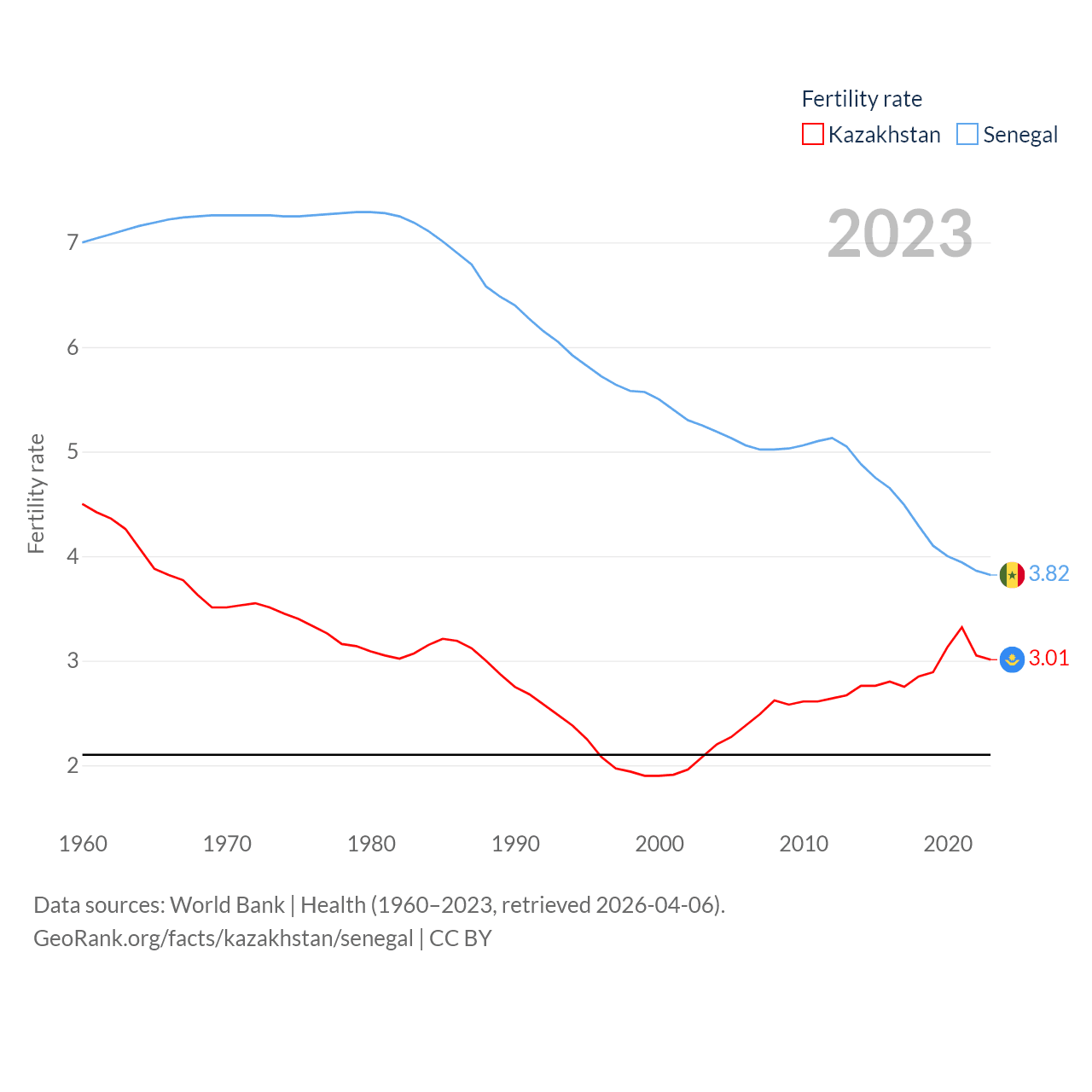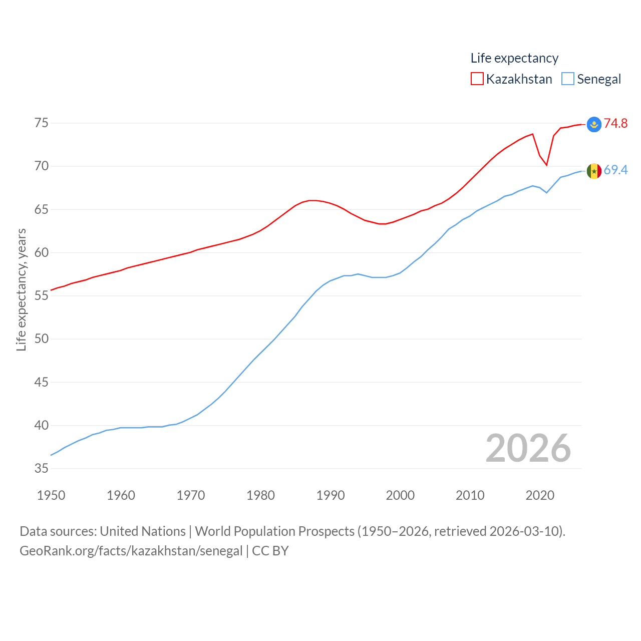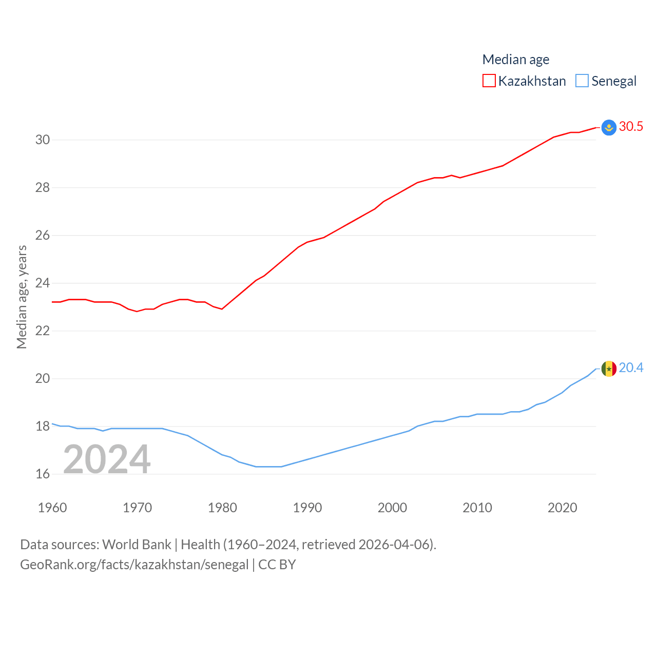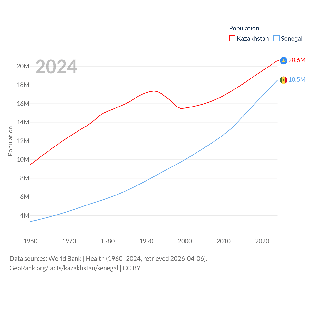 Kazakhstan has a population of 20.6M (ranked 64/197), compared with 18.5M in Senegal (ranked 69/197). Kazakhstan's land area is 1,042,360 sq mi versus 74,336 sq mi for Senegal (ranked 9th vs. 85th).