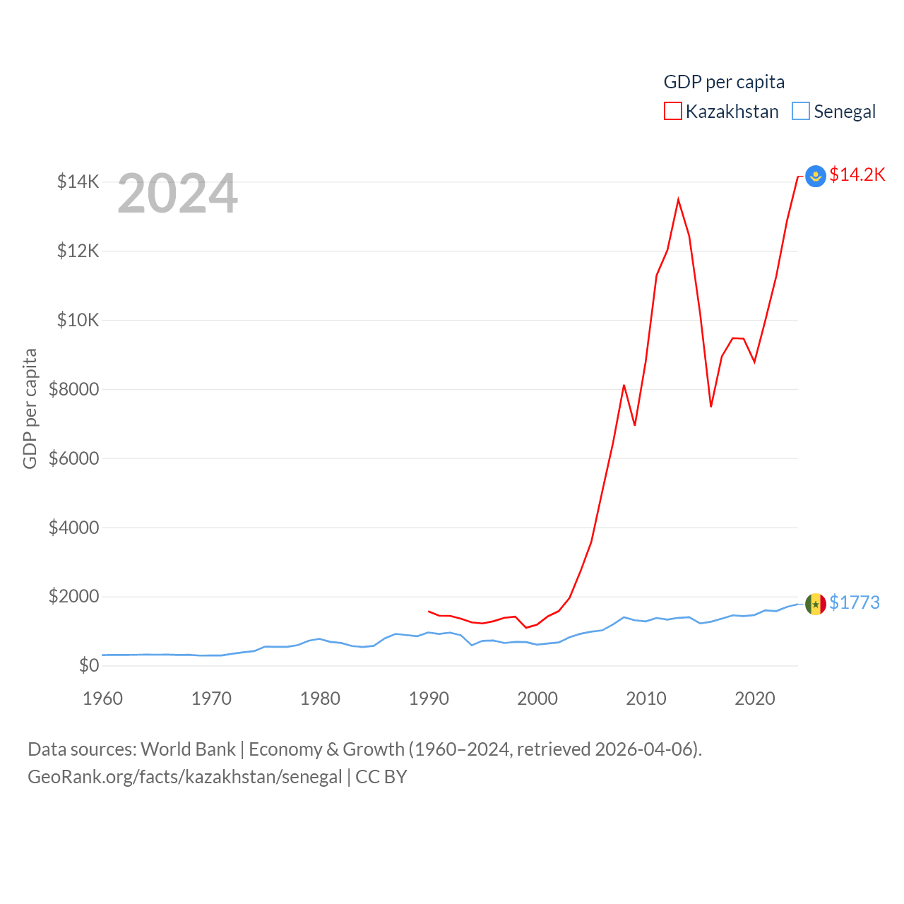 By GDP, Kazakhstan ranks 48/197 ($291B) and Senegal ranks 109/197 ($32.8B). By GDP per capita, Kazakhstan ranks 71/197 ($14,155), while Senegal ranks 159/197 ($1,773).