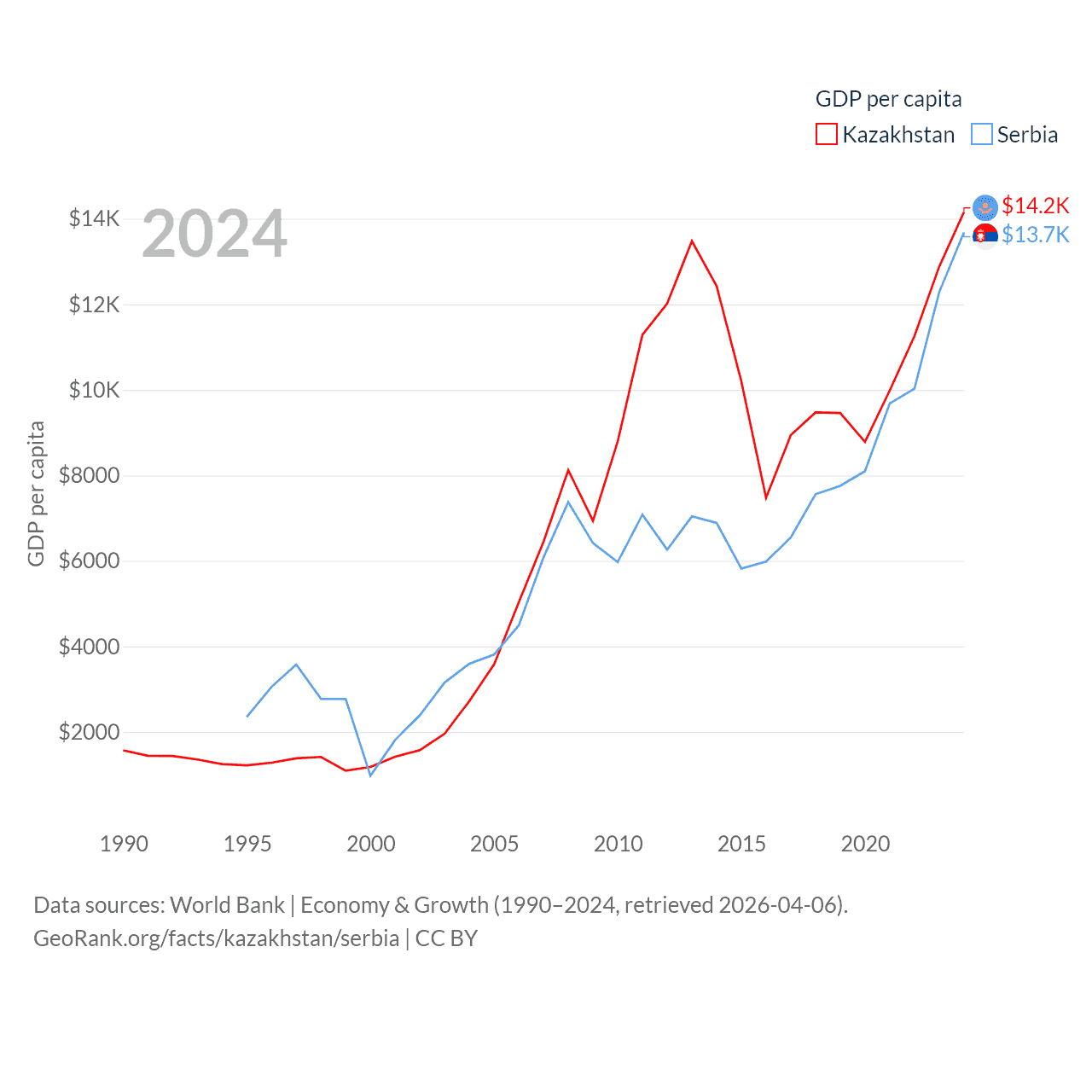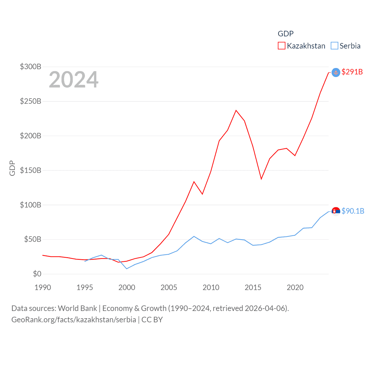 By GDP, Kazakhstan ranks 48/197 ($291B) and Serbia ranks 76/197 ($90.1B). By GDP per capita, Kazakhstan ranks 71/197 ($14,155), while Serbia ranks 73/197 ($13,679).