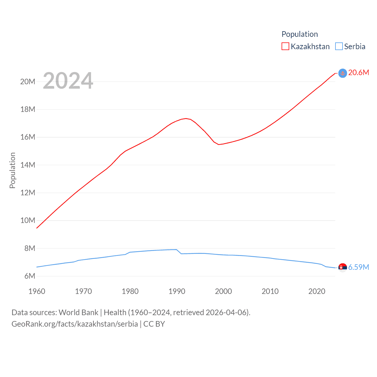 Kazakhstan has a population of 20.6M (ranked 64/197), compared with 6.59M in Serbia (ranked 109/197). Kazakhstan's land area is 1,042,360 sq mi versus 32,467 sq mi for Serbia (ranked 9th vs. 111th).