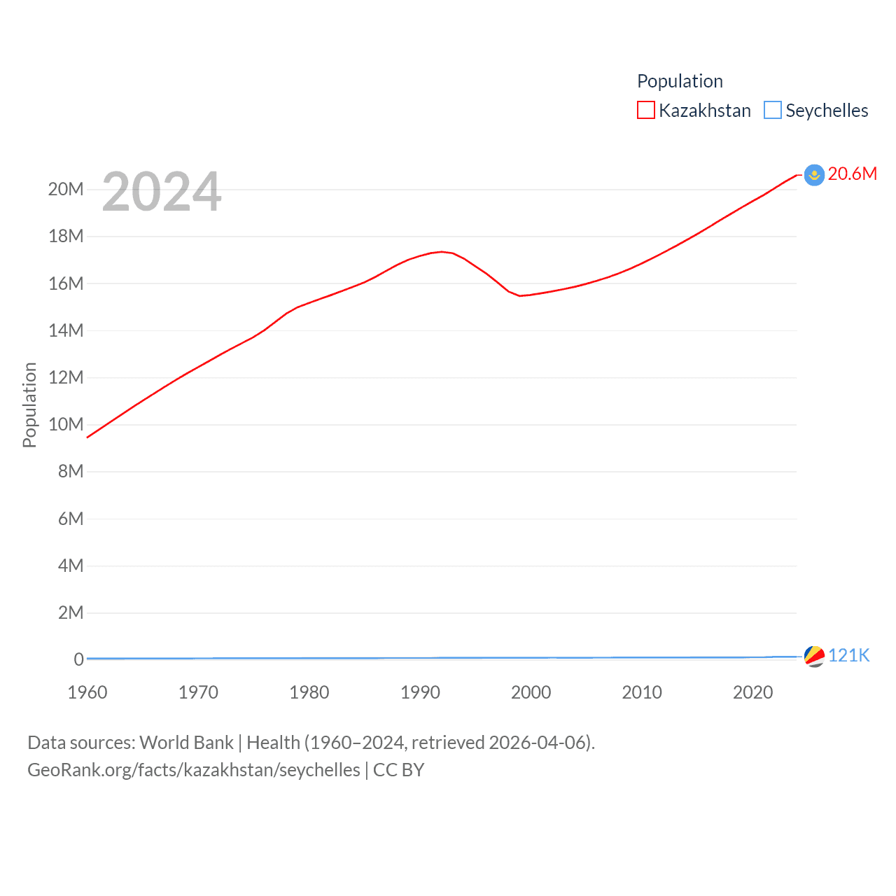 Kazakhstan has a population of 20.6M (ranked 64/197), compared with 121K in The Seychelles (ranked 181/197). Kazakhstan's land area is 1,042,360 sq mi versus 177.6 sq mi for The Seychelles (ranked 9th vs. 181st).