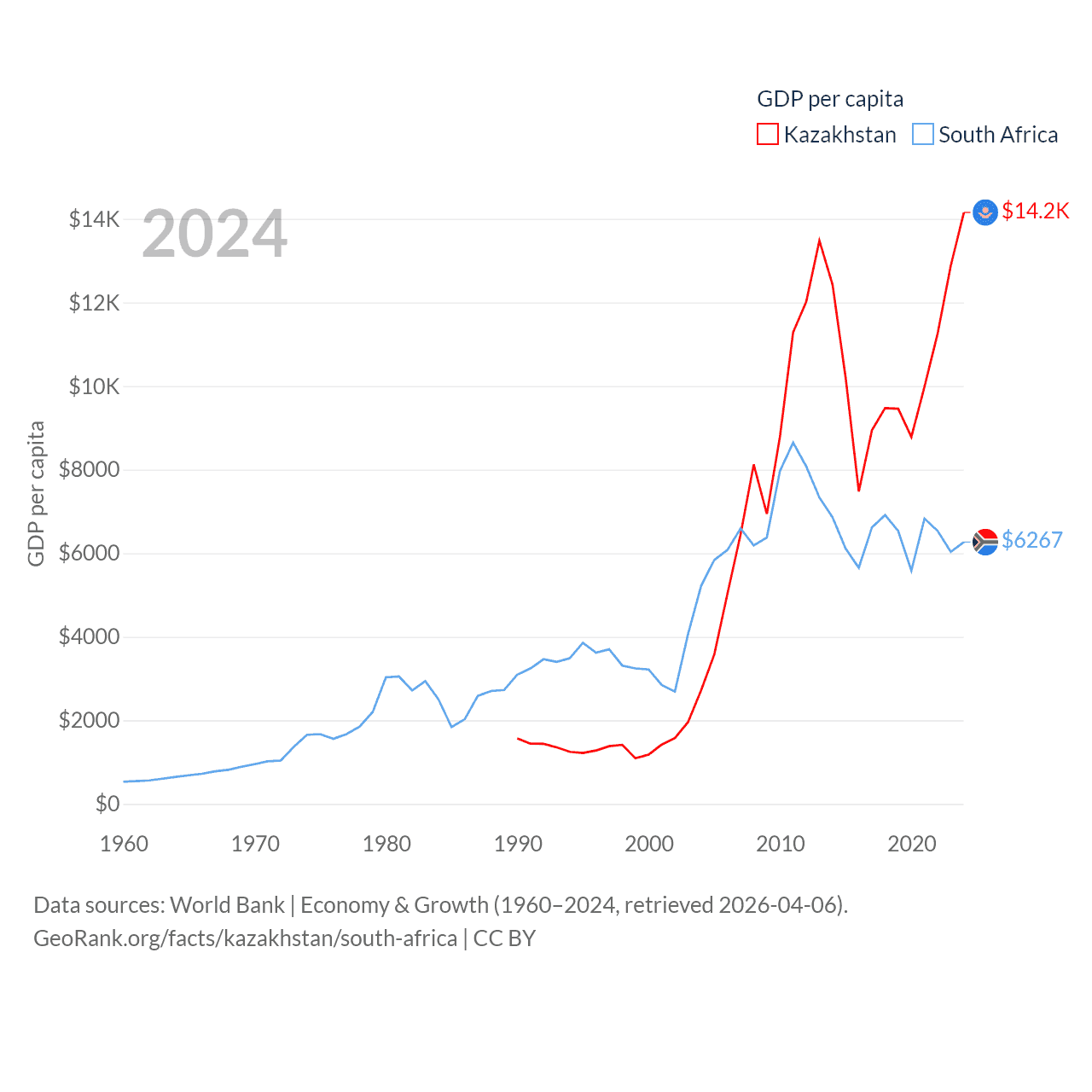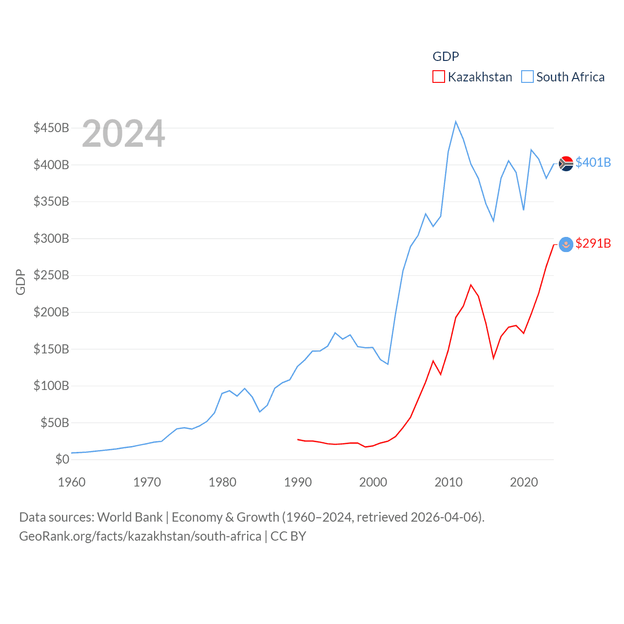 By GDP, Kazakhstan ranks 48/197 ($291B) and South Africa ranks 40/197 ($401B). By GDP per capita, Kazakhstan ranks 71/197 ($14,155), while South Africa ranks 111/197 ($6,267).