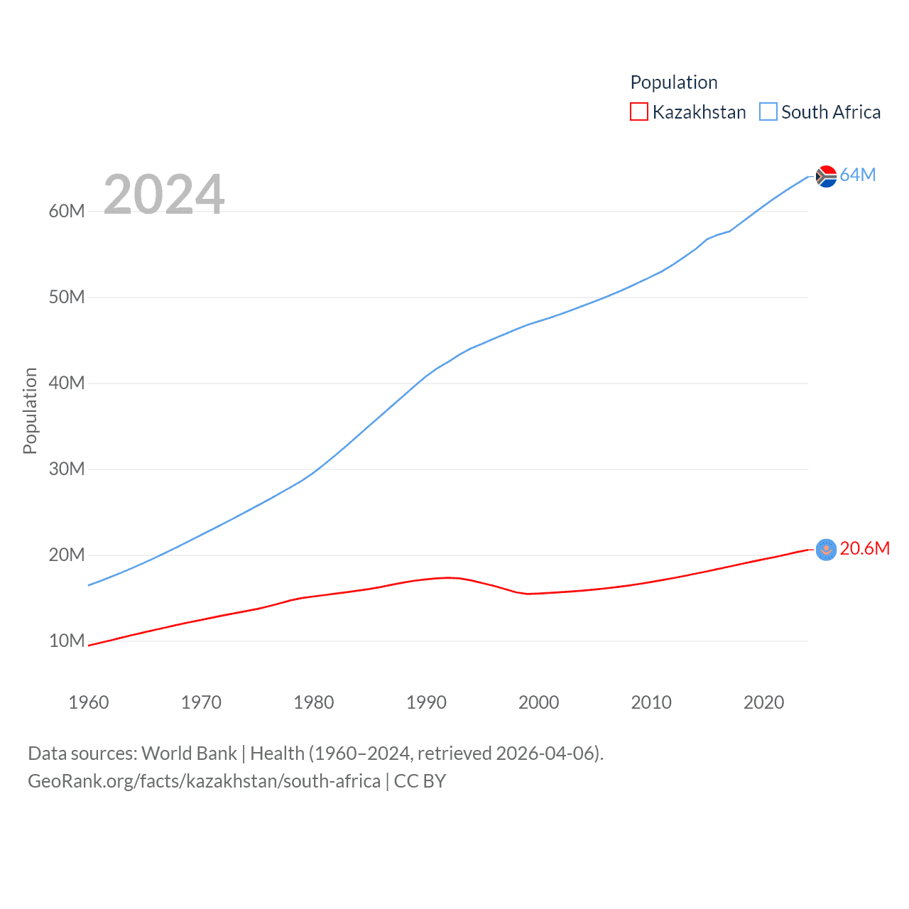 Kazakhstan has a population of 20.6M (ranked 64/197), compared with 64M in South Africa (ranked 24/197). Kazakhstan's land area is 1,042,360 sq mi versus 468,377 sq mi for South Africa (ranked 9th vs. 24th).