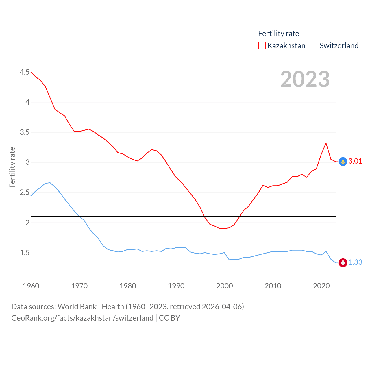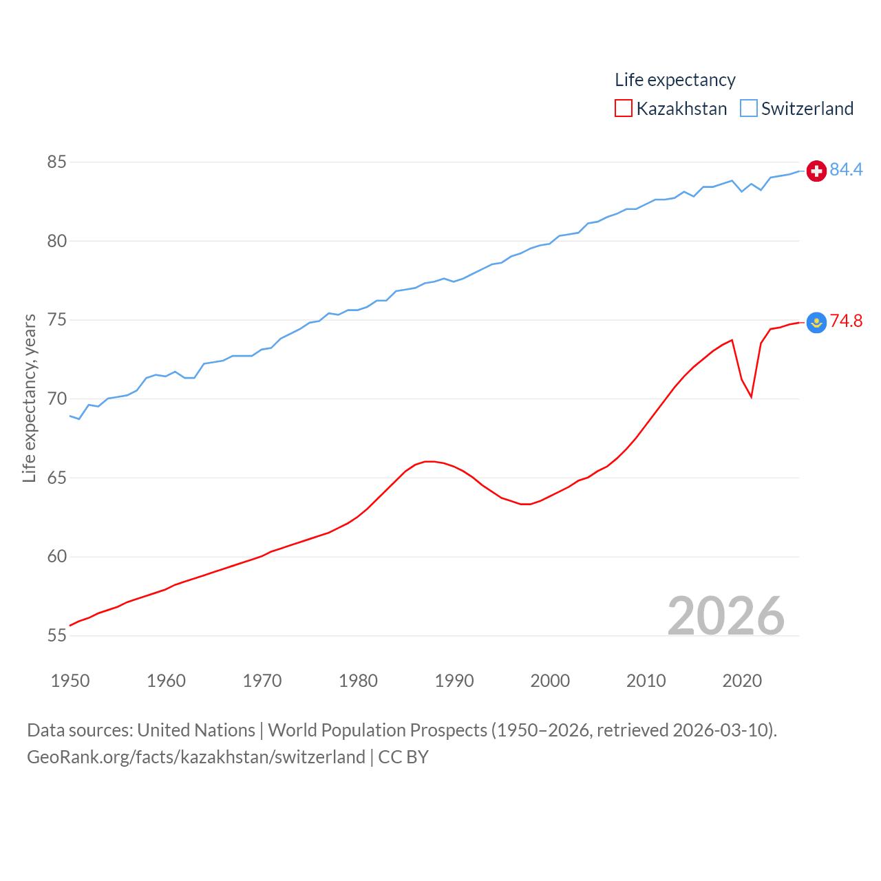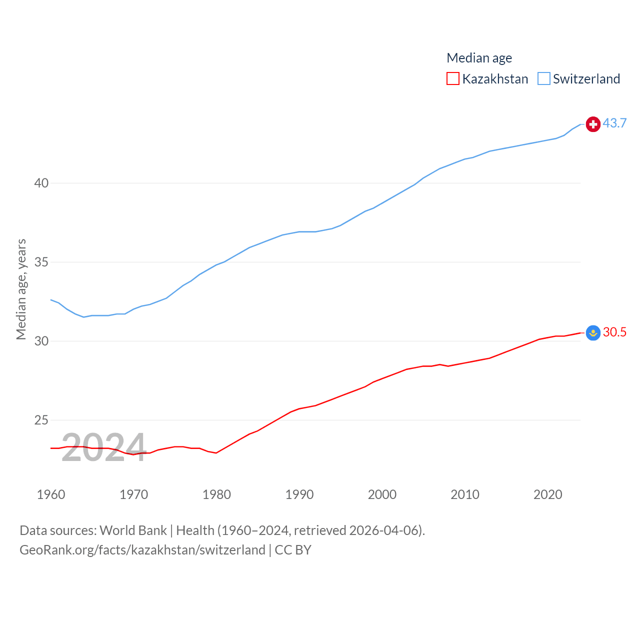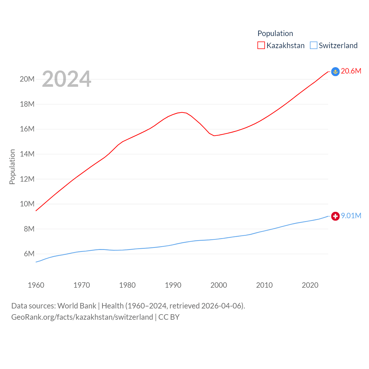 Kazakhstan has a population of 20.6M (ranked 64/197), compared with 9.01M in Switzerland (ranked 101/197). Kazakhstan's land area is 1,042,360 sq mi versus 15,255 sq mi for Switzerland (ranked 9th vs. 131st).
