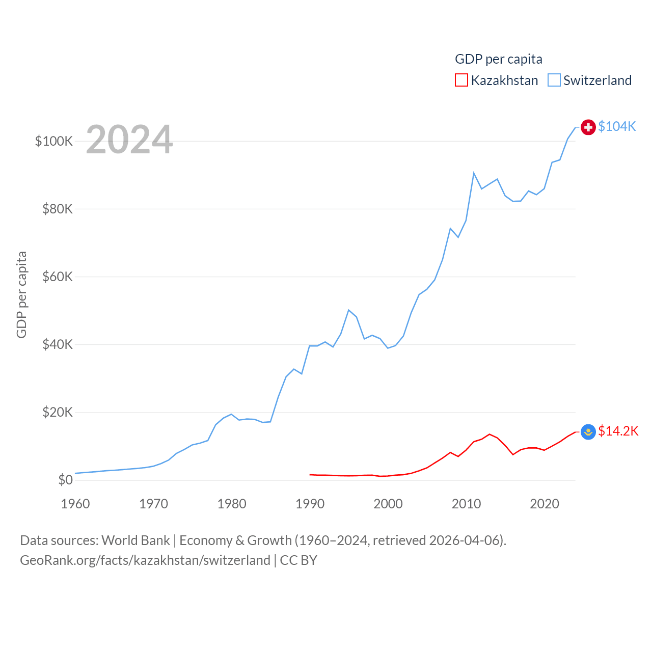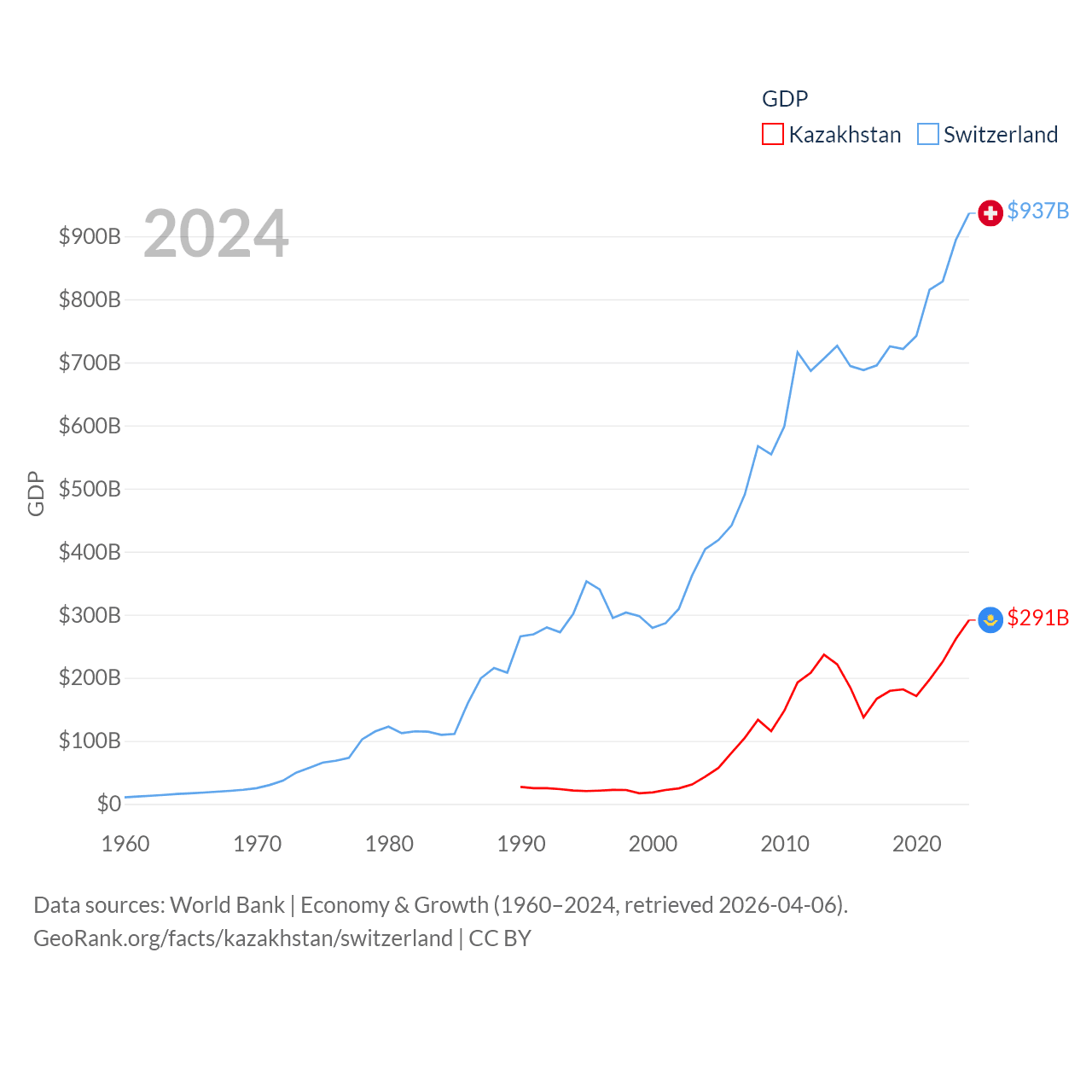 By GDP, Kazakhstan ranks 48/197 ($291B) and Switzerland ranks 20/197 ($937B). By GDP per capita, Kazakhstan ranks 71/197 ($14,155), while Switzerland ranks 5/197 ($103,998).