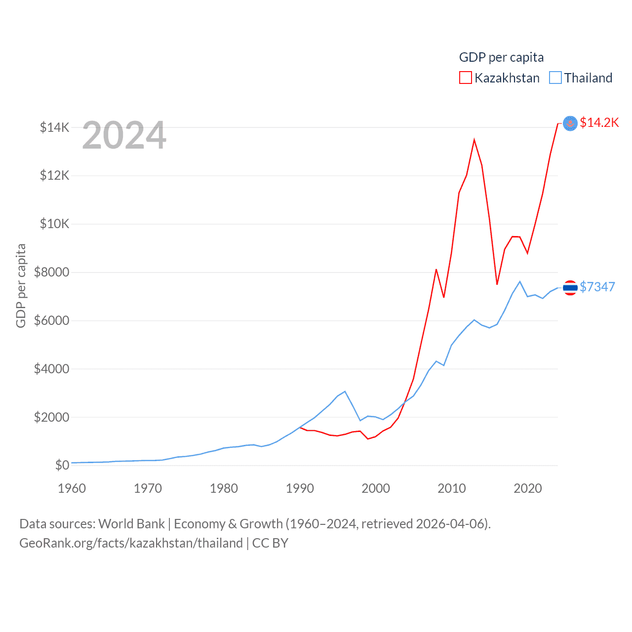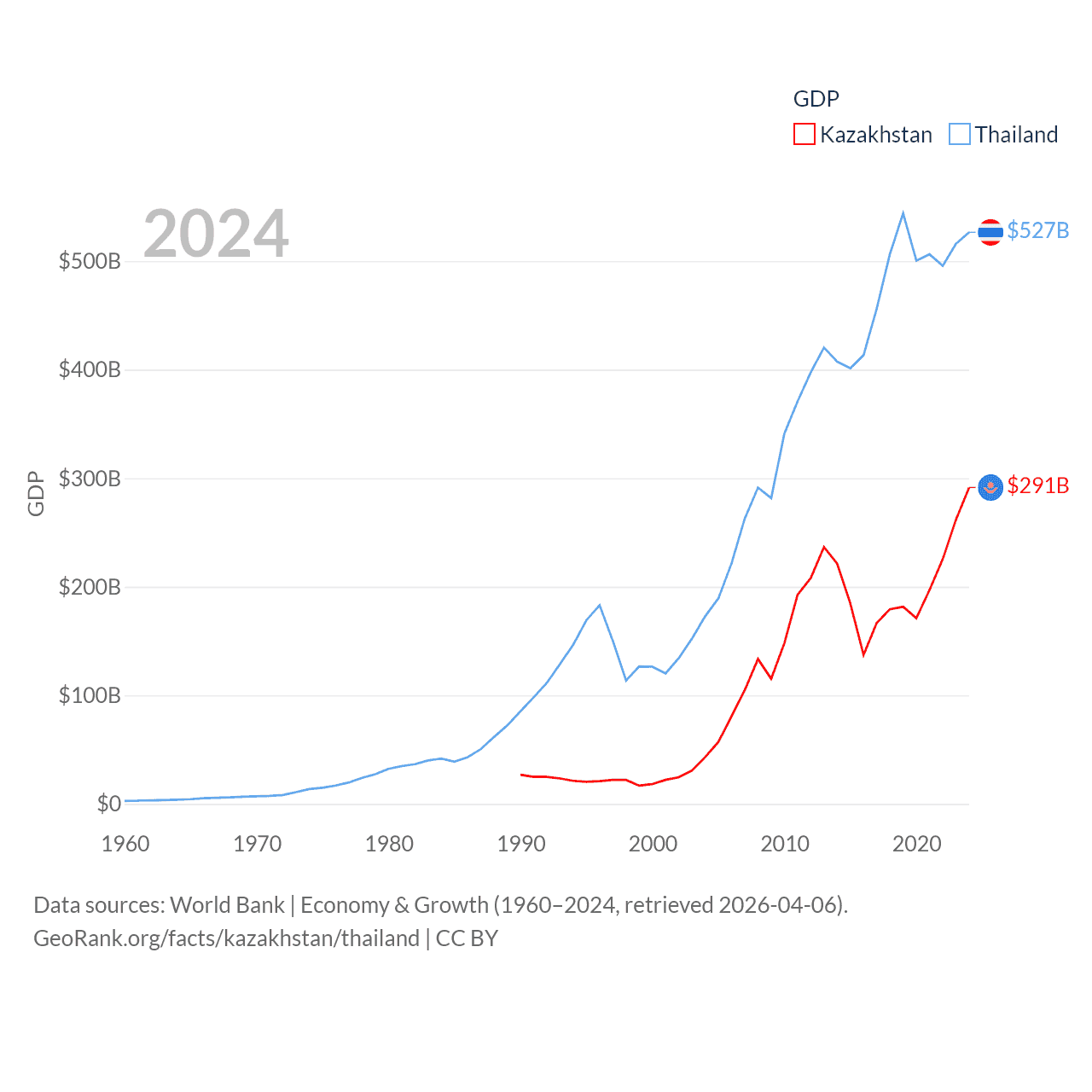 By GDP, Kazakhstan ranks 48/197 ($291B) and Thailand ranks 31/197 ($527B). By GDP per capita, Kazakhstan ranks 71/197 ($14,155), while Thailand ranks 100/197 ($7,347).