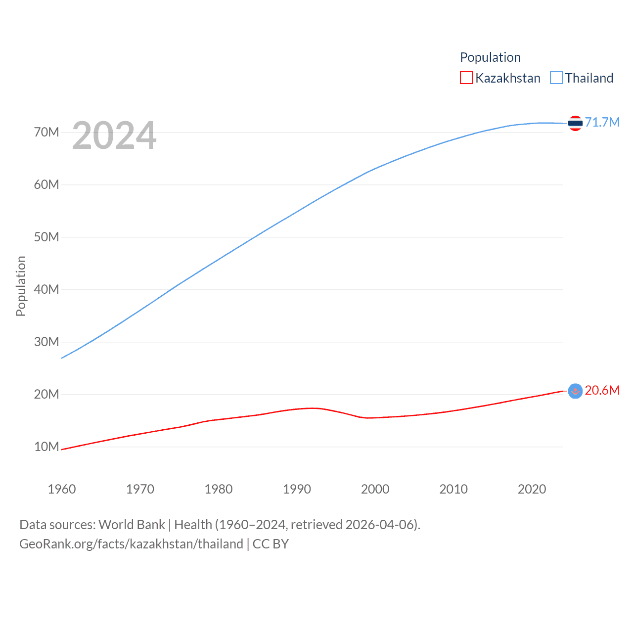 Kazakhstan has a population of 20.6M (ranked 64/197), compared with 71.7M in Thailand (ranked 20/197). Kazakhstan's land area is 1,042,360 sq mi versus 197,256 sq mi for Thailand (ranked 9th vs. 50th).