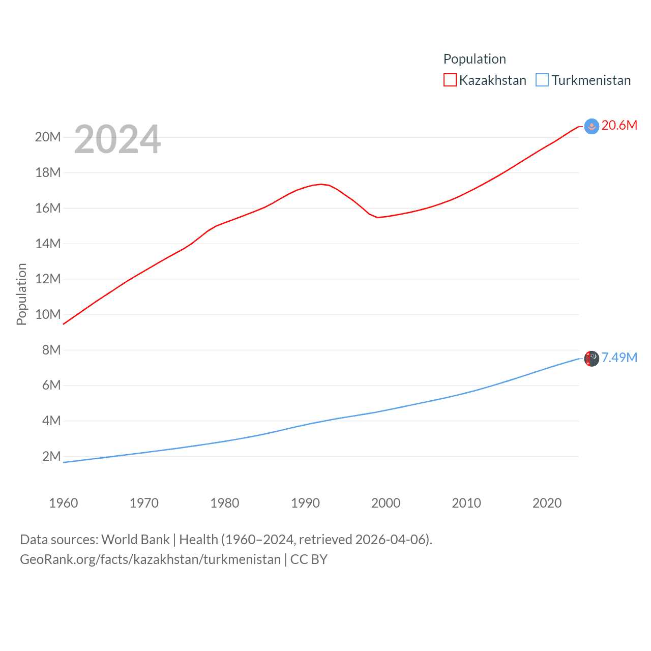 Kazakhstan has a population of 20.6M (ranked 64/197), compared with 7.49M in Turkmenistan (ranked 104/197). Kazakhstan's land area is 1,042,360 sq mi versus 181,441 sq mi for Turkmenistan (ranked 9th vs. 53rd).