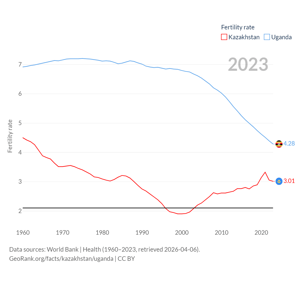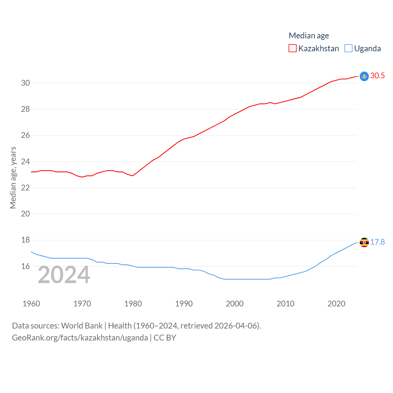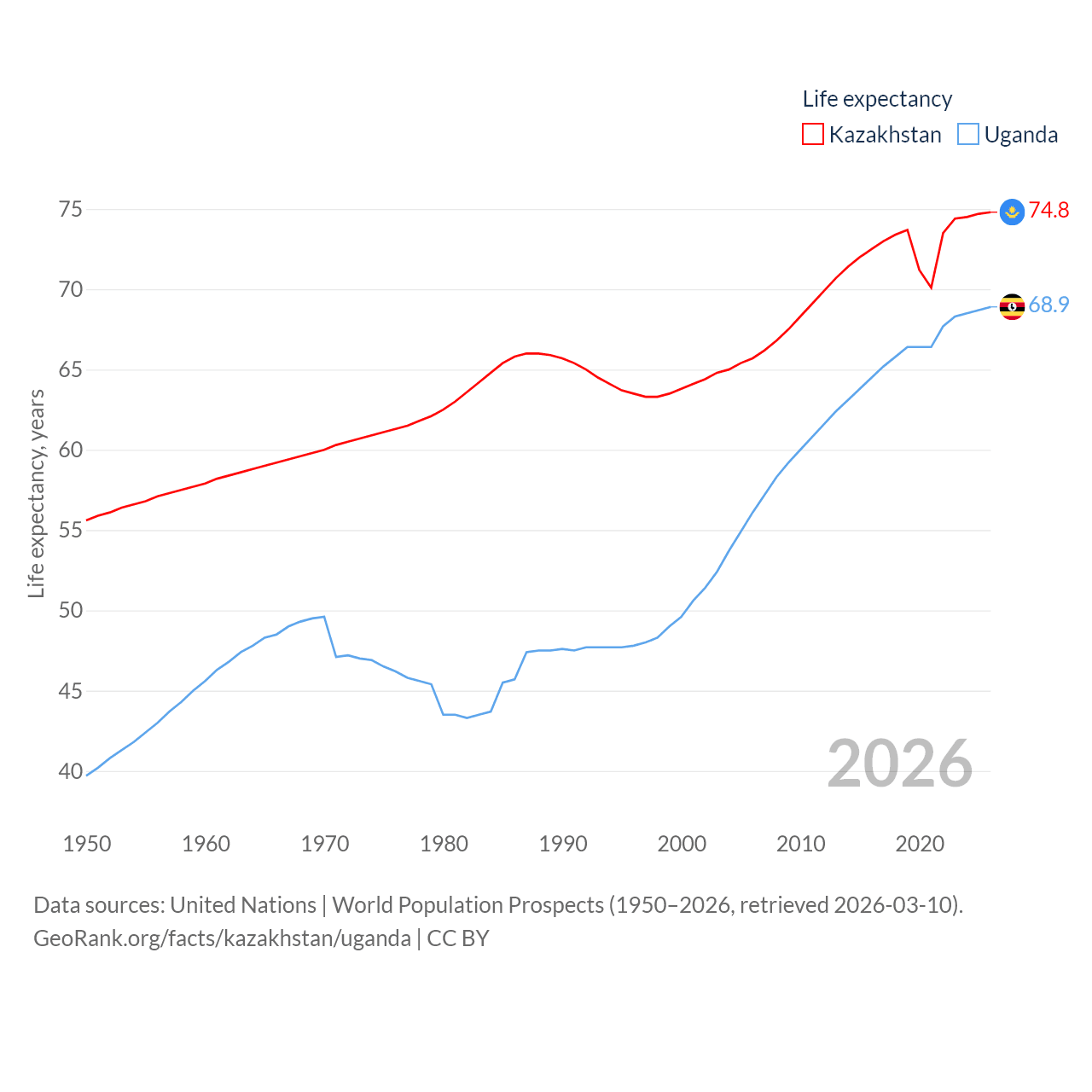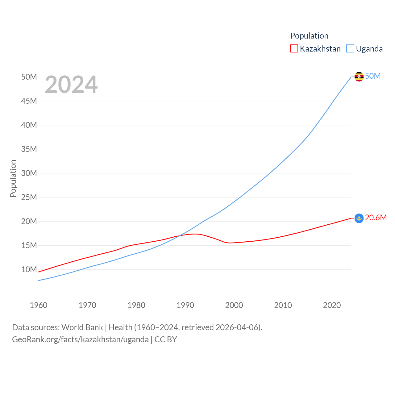 Kazakhstan has a population of 20.6M (ranked 64/197), compared with 50M in Uganda (ranked 31/197). Kazakhstan's land area is 1,042,360 sq mi versus 77,421 sq mi for Uganda (ranked 9th vs. 84th).