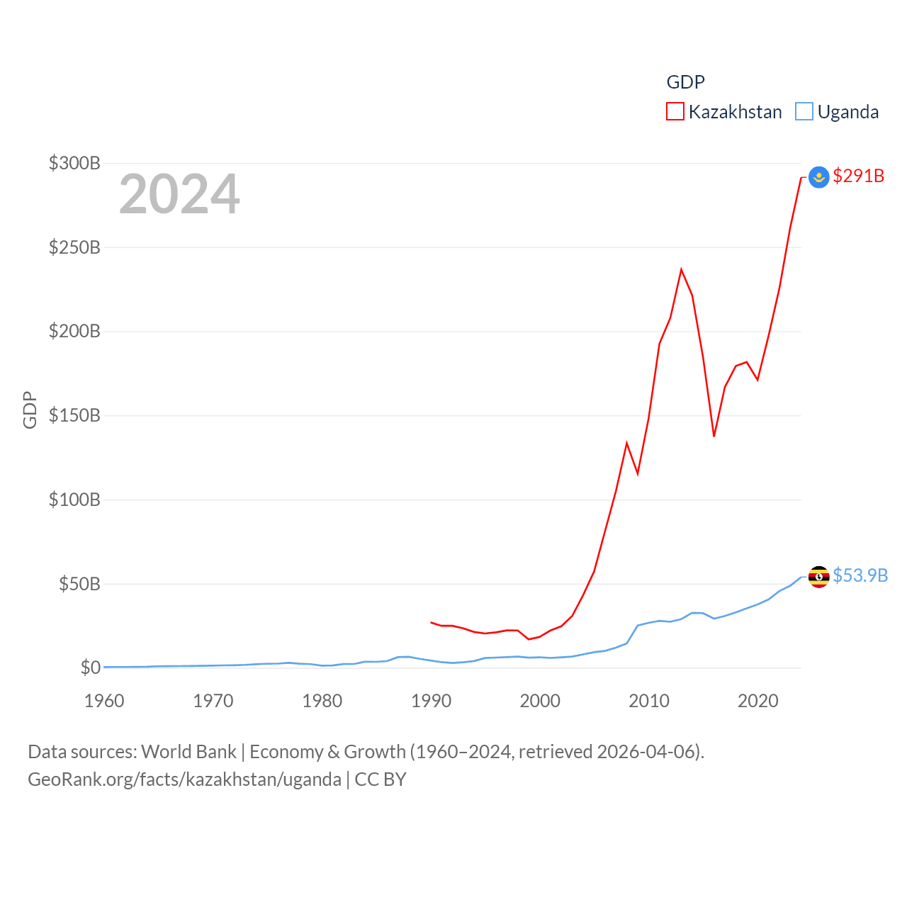 By GDP, Kazakhstan ranks 48/197 ($291B) and Uganda ranks 89/197 ($53.9B). By GDP per capita, Kazakhstan ranks 71/197 ($14,155), while Uganda ranks 176/197 ($1,078).
