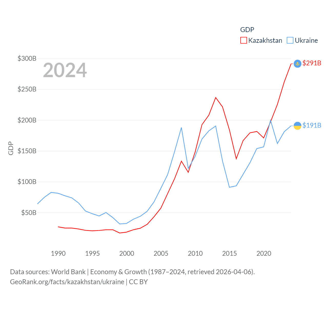 By GDP, Kazakhstan ranks 48/197 ($291B) and Ukraine ranks 57/197 ($191B). By GDP per capita, Kazakhstan ranks 71/197 ($14,155), while Ukraine ranks 120/197 ($5,038).