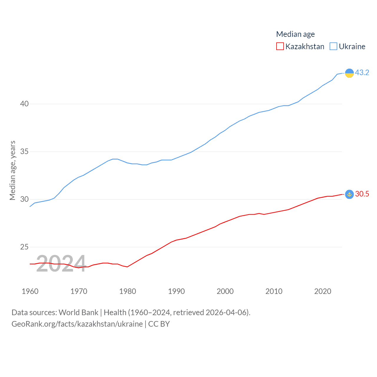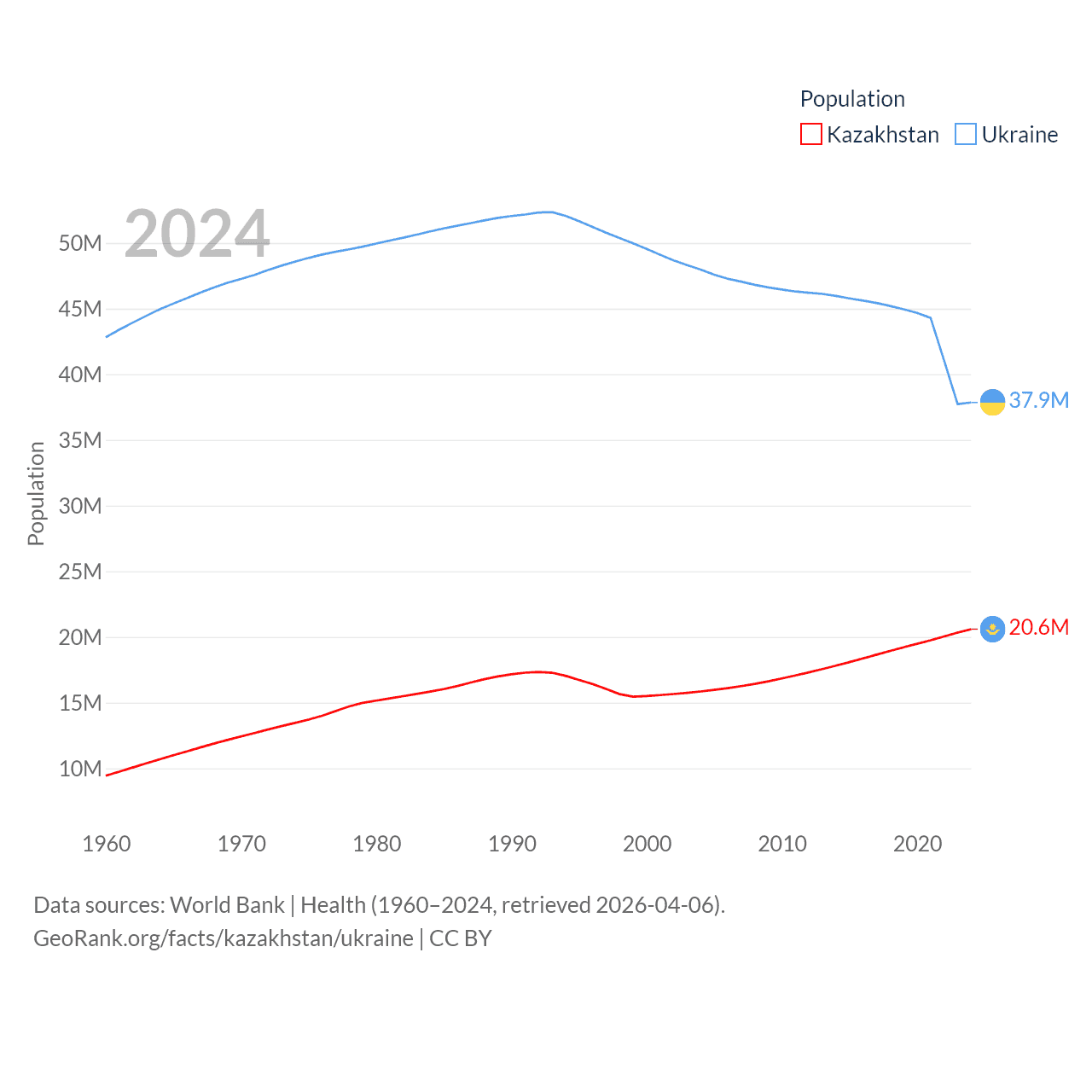 Kazakhstan has a population of 20.6M (ranked 64/197), compared with 37.9M in Ukraine (ranked 41/197). Kazakhstan's land area is 1,042,360 sq mi versus 223,708 sq mi for Ukraine (ranked 9th vs. 46th).