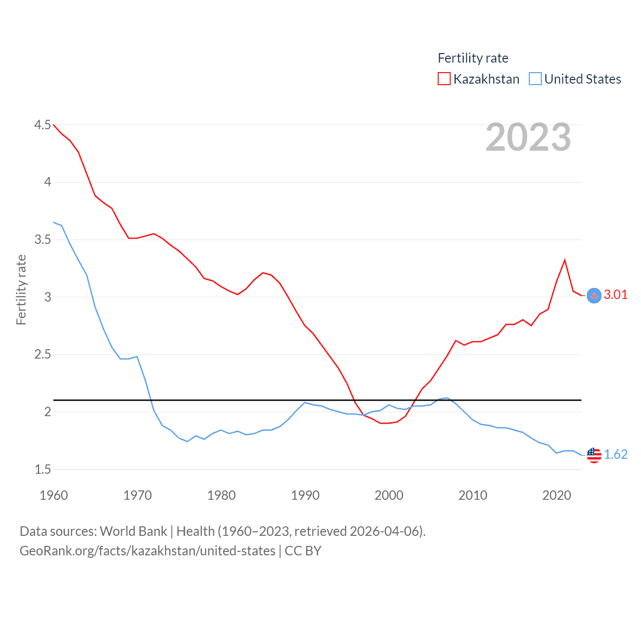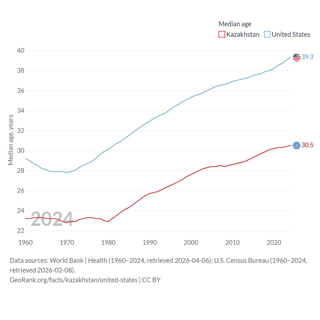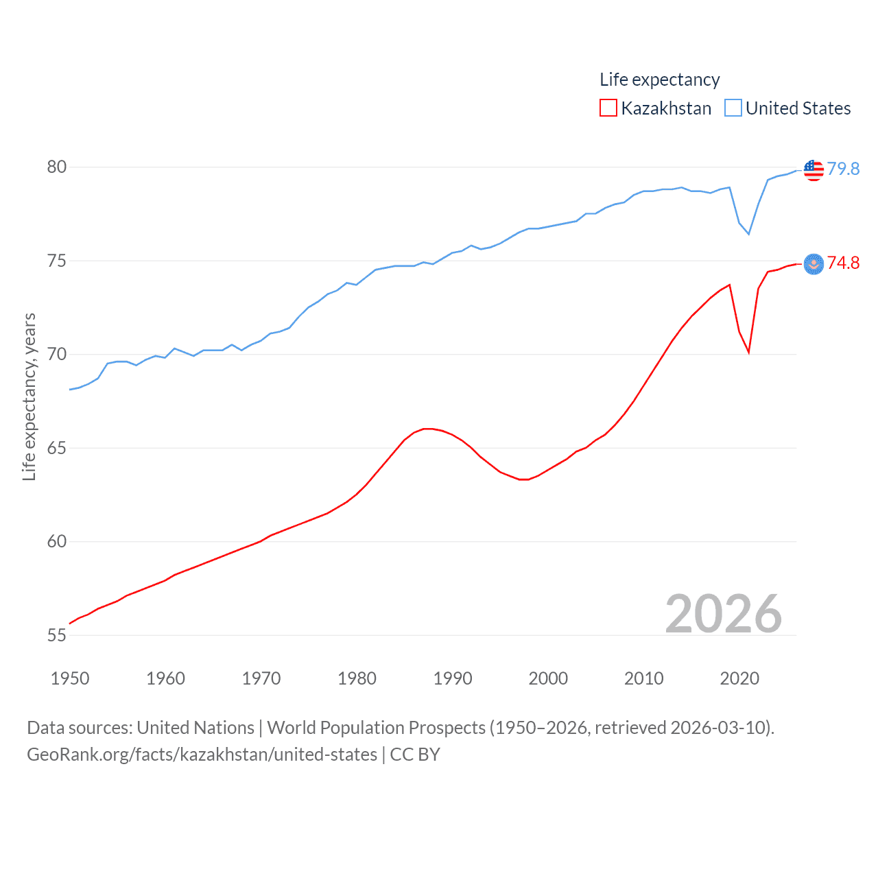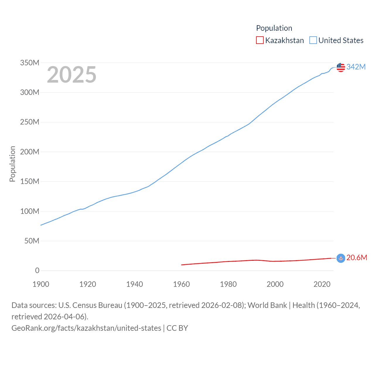 Kazakhstan has a population of 20.6M (ranked 64/197), compared with 342M in The United States (ranked 3/197). Kazakhstan's land area is 1,042,360 sq mi versus 3,531,839 sq mi for The United States (ranked 9th vs. 3rd).
