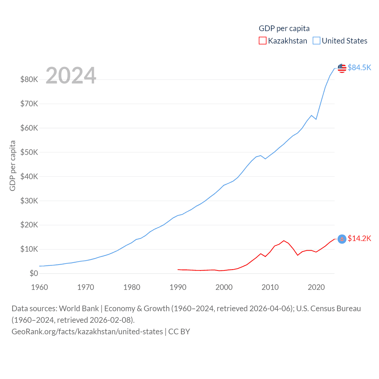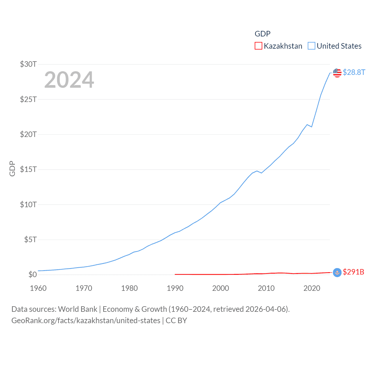 By GDP, Kazakhstan ranks 48/197 ($291B) and The United States ranks 1/197 ($28.8T). By GDP per capita, Kazakhstan ranks 71/197 ($14,155), while The United States ranks 10/197 ($84,534).