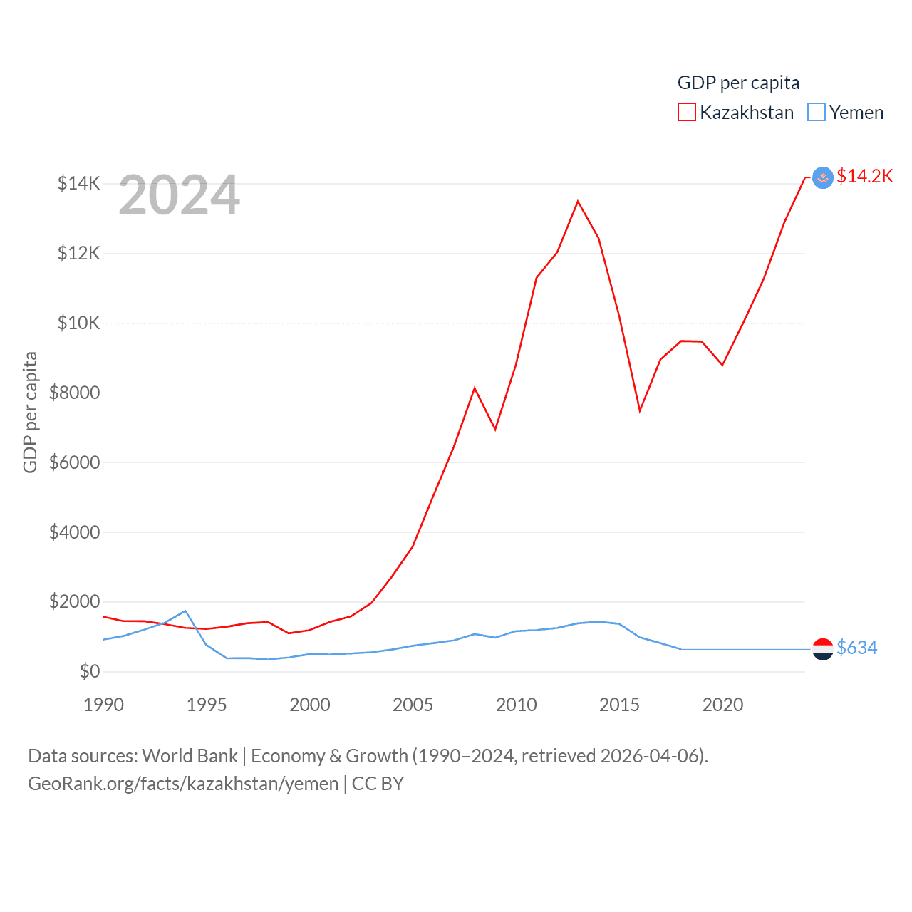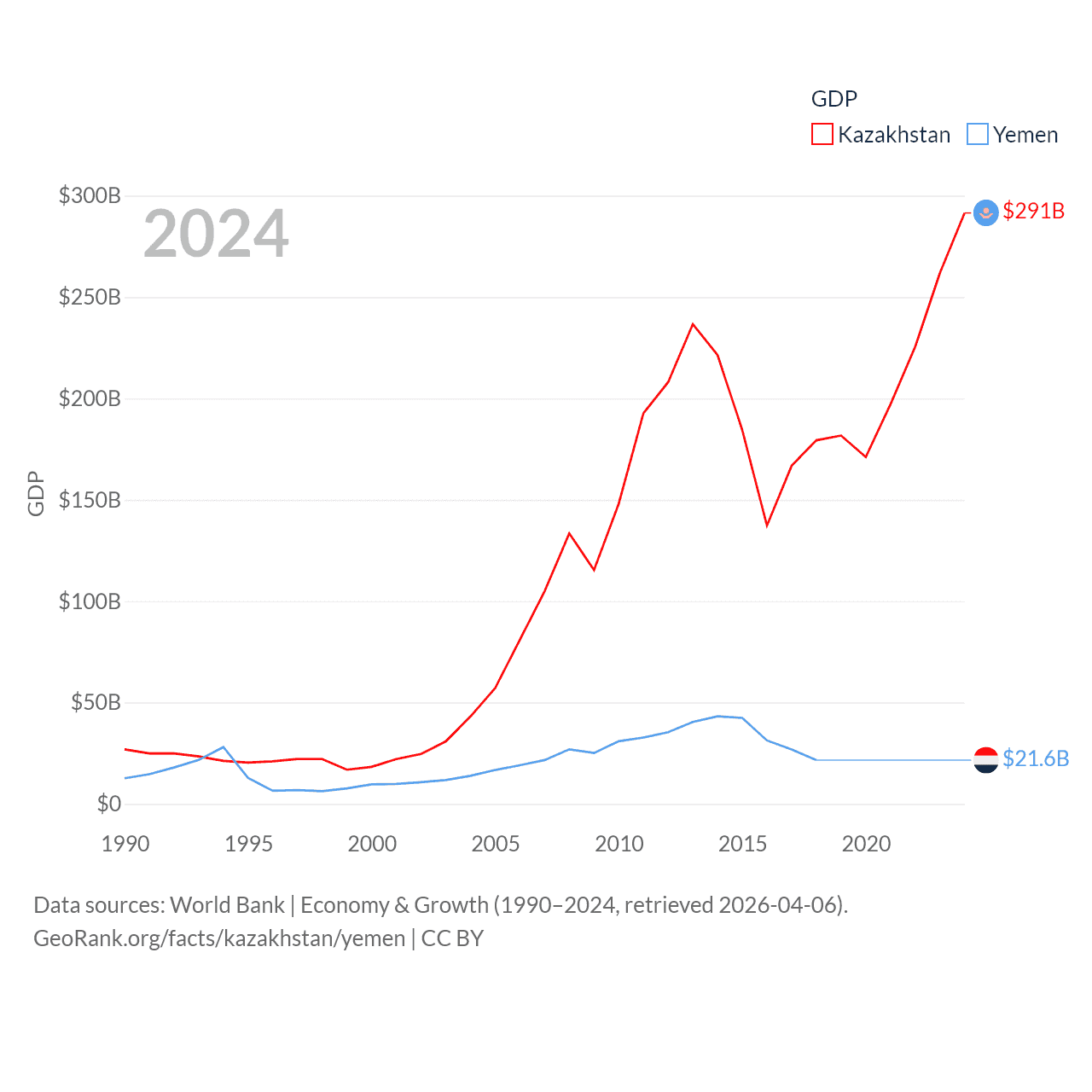 By GDP, Kazakhstan ranks 48/197 ($291B) and Yemen ranks 125/197 ($21.6B). By GDP per capita, Kazakhstan ranks 71/197 ($14,155), while Yemen ranks 191/197 ($634).