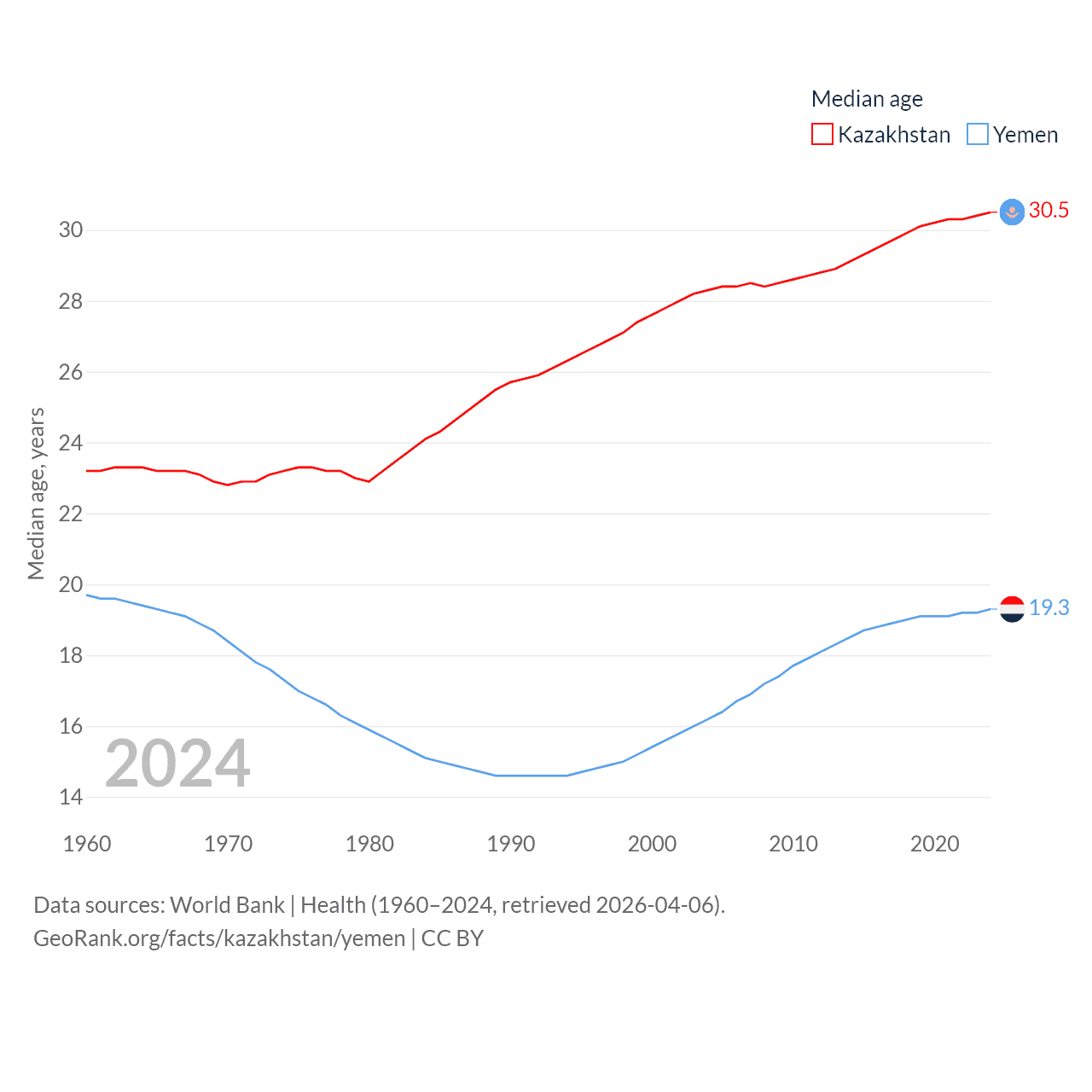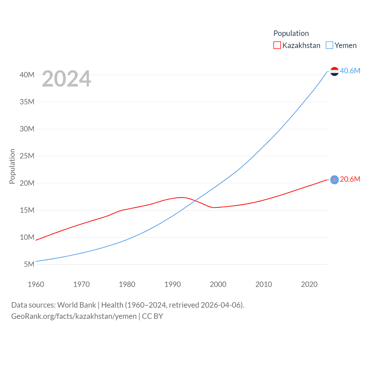 Kazakhstan has a population of 20.6M (ranked 64/197), compared with 40.6M in Yemen (ranked 38/197). Kazakhstan's land area is 1,042,360 sq mi versus 203,850 sq mi for Yemen (ranked 9th vs. 49th).