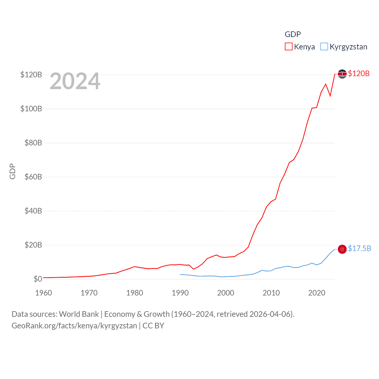 By GDP, Kenya ranks 64/197 ($120B) and Kyrgyzstan ranks 135/197 ($17.5B). By GDP per capita, Kenya ranks 154/197 ($2,132), while Kyrgyzstan ranks 150/197 ($2,420).