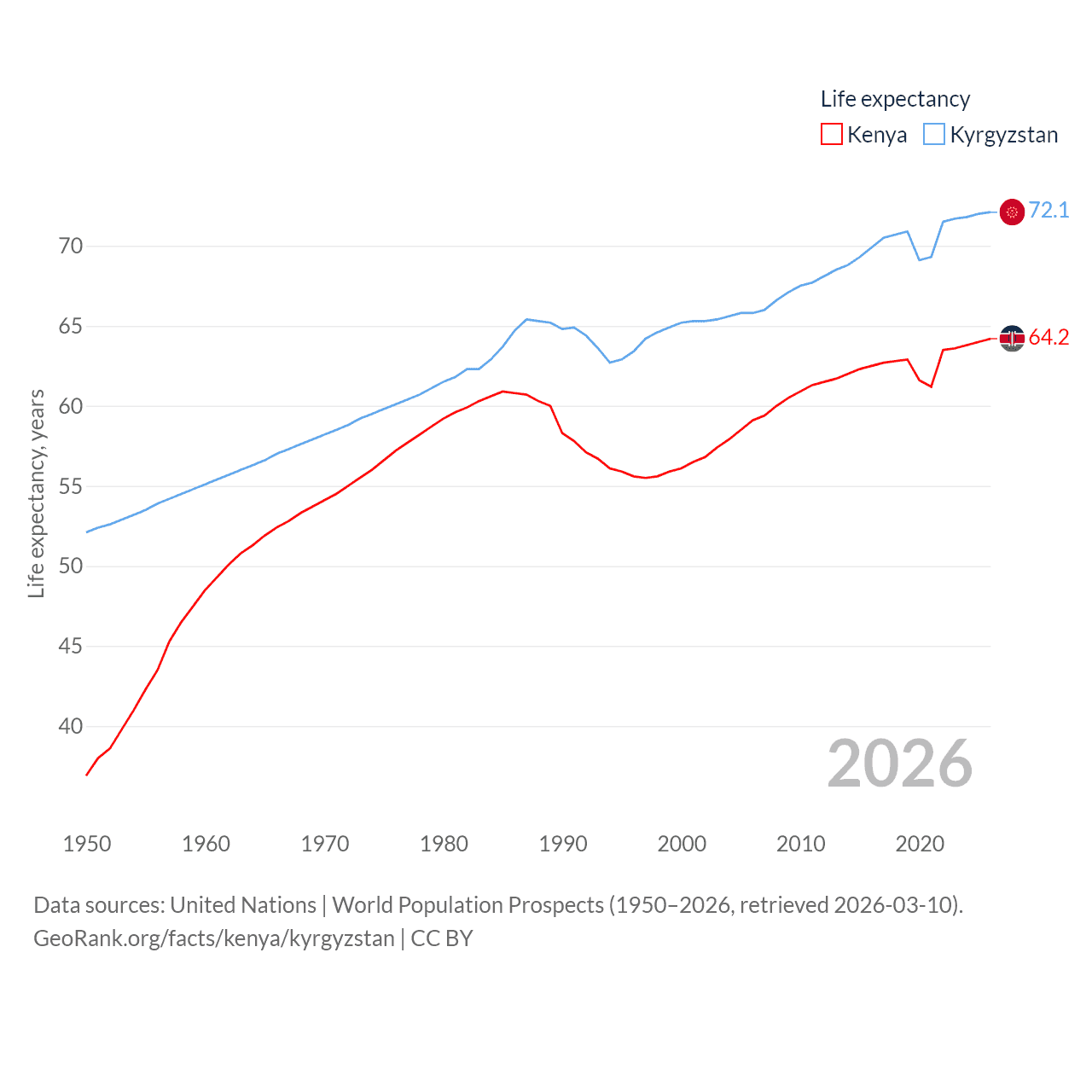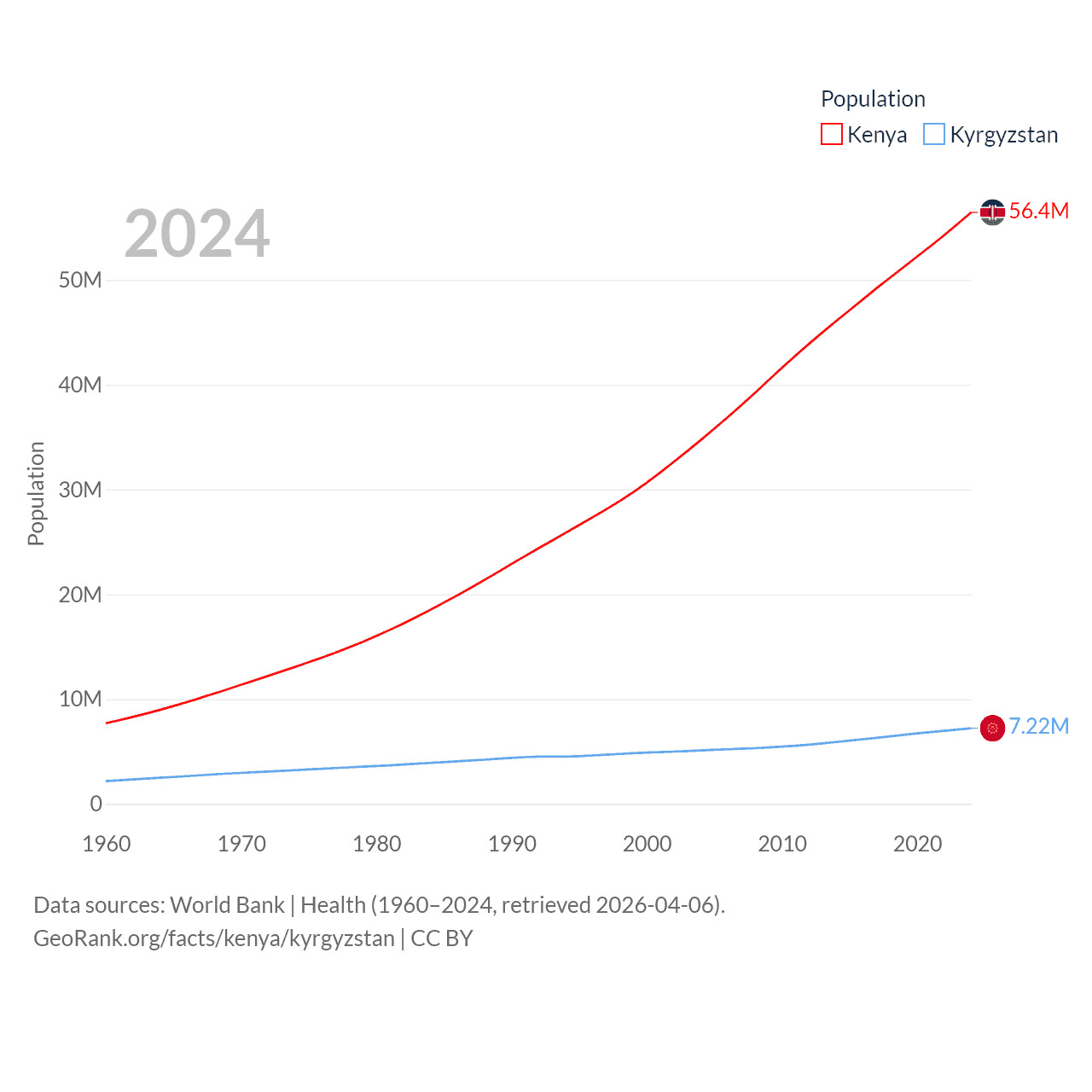 Kenya has a population of 56.4M (ranked 26/197), compared with 7.22M in Kyrgyzstan (ranked 106/197). Kenya's land area is 224,278 sq mi versus 74,054 sq mi for Kyrgyzstan (ranked 45th vs. 86th).