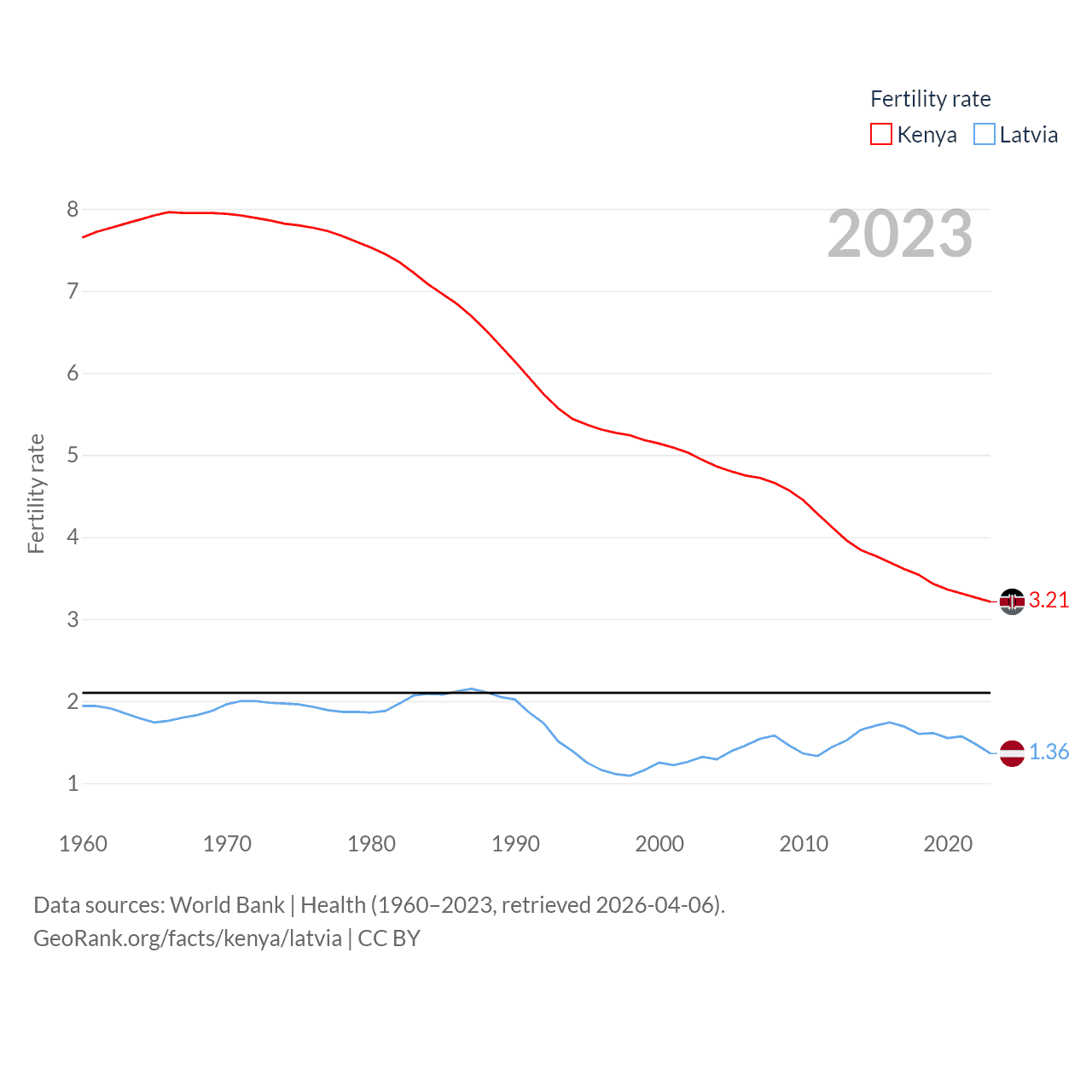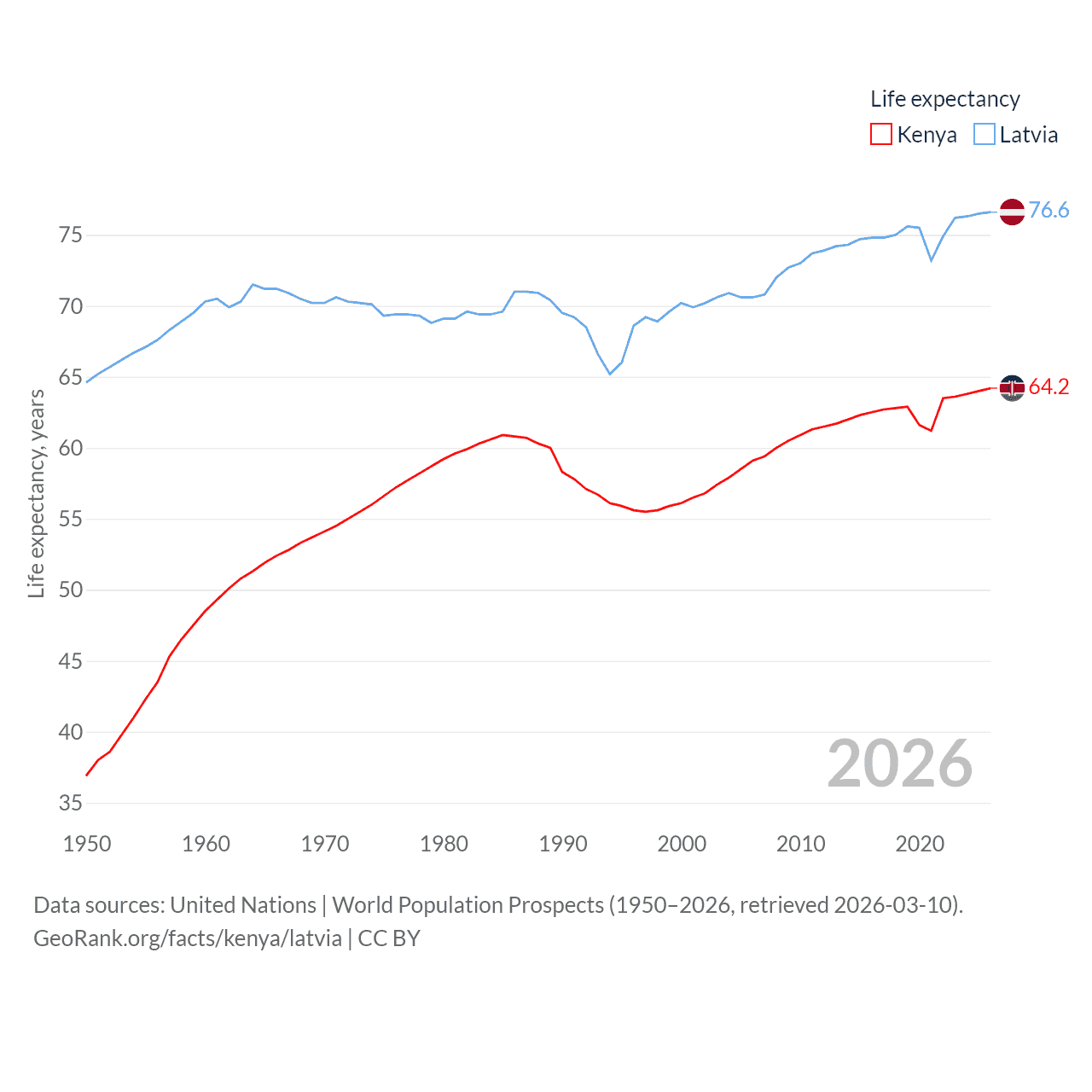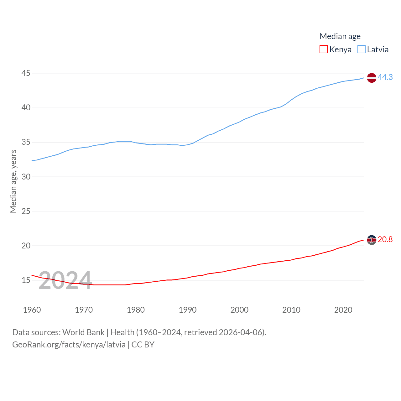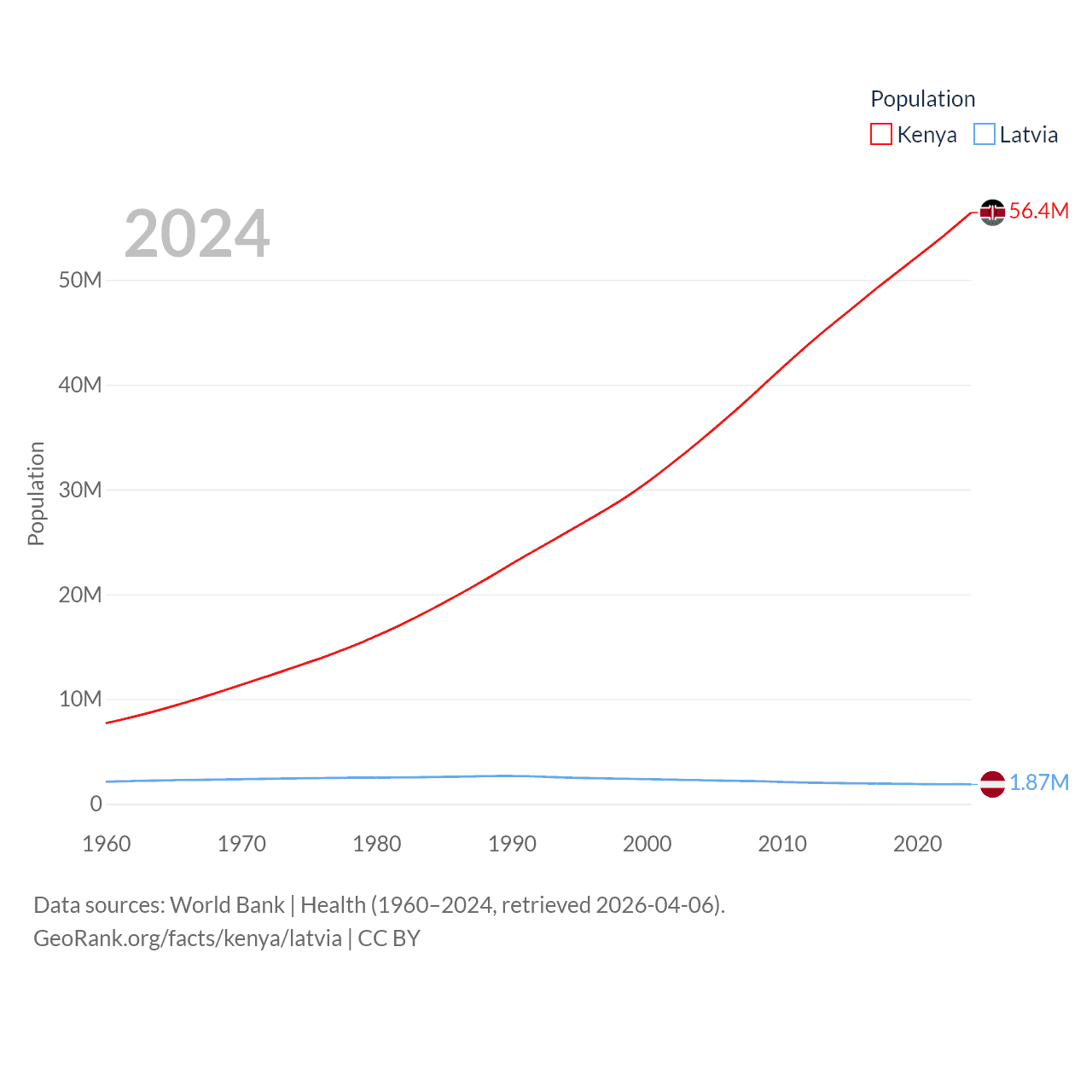 Kenya has a population of 56.4M (ranked 26/197), compared with 1.87M in Latvia (ranked 149/197). Kenya's land area is 224,278 sq mi versus 24,027 sq mi for Latvia (ranked 45th vs. 121st).