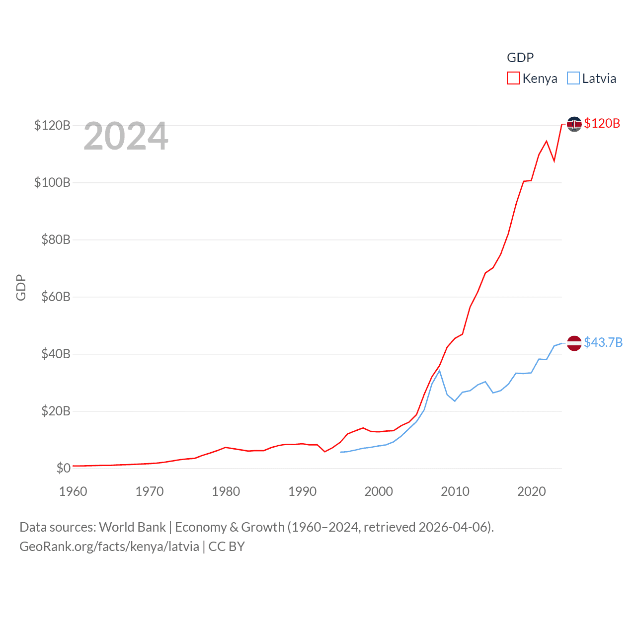 By GDP, Kenya ranks 64/197 ($120B) and Latvia ranks 99/197 ($43.7B). By GDP per capita, Kenya ranks 154/197 ($2,132), while Latvia ranks 54/197 ($23,409).