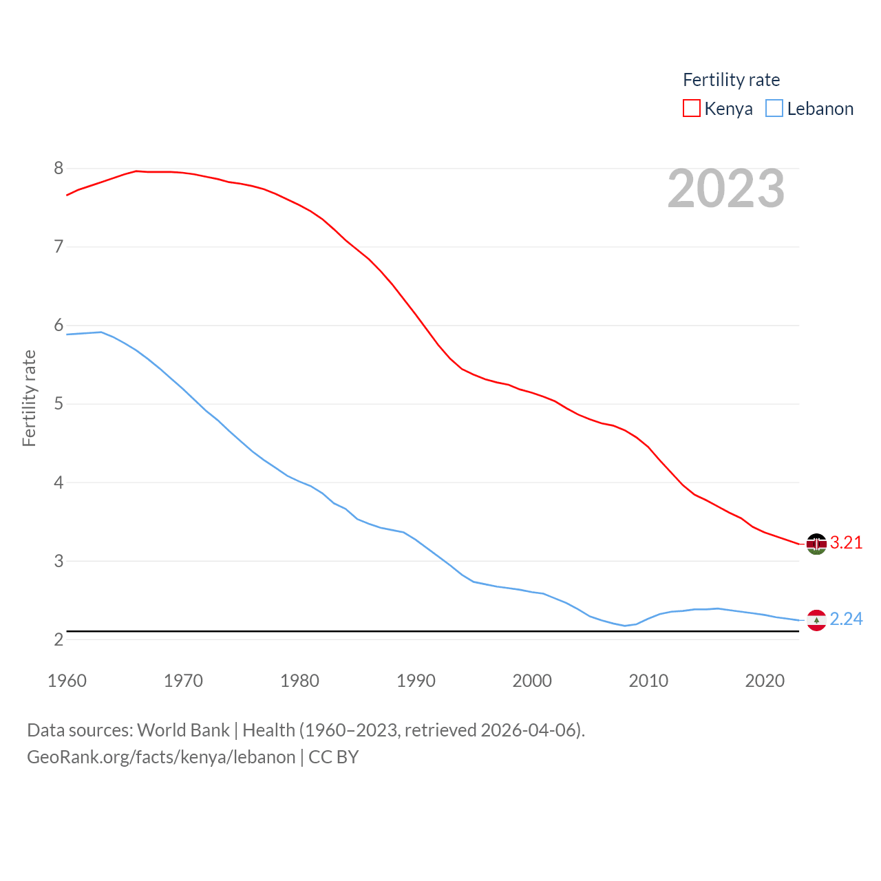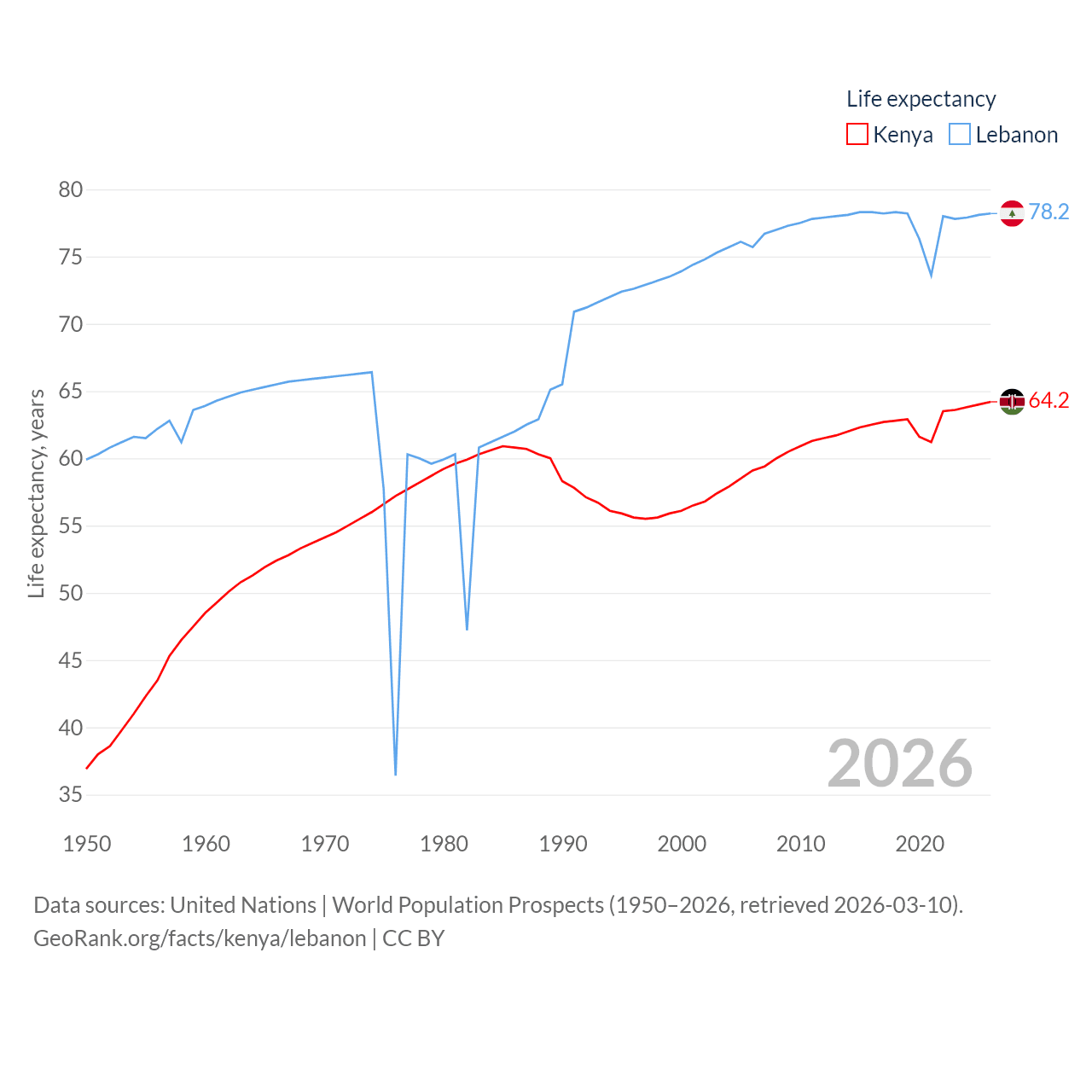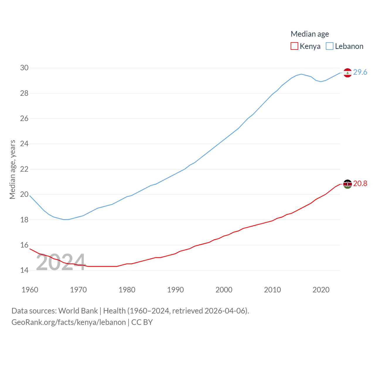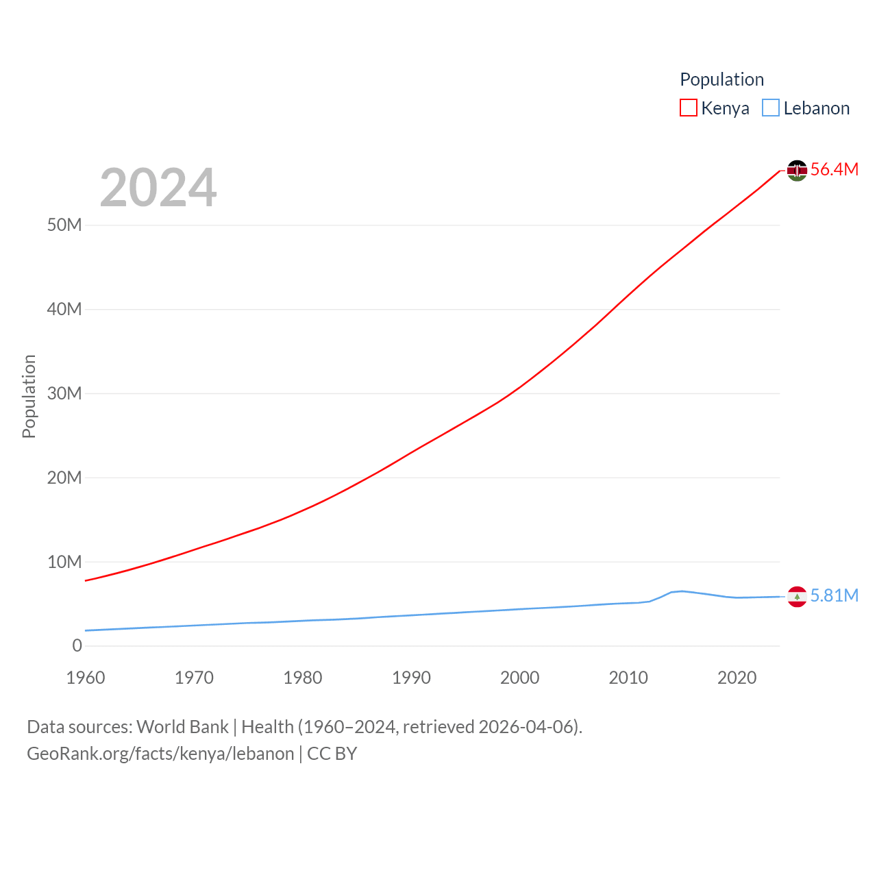 Kenya has a population of 56.4M (ranked 26/197), compared with 5.81M in Lebanon (ranked 115/197). Kenya's land area is 224,278 sq mi versus 3,950 sq mi for Lebanon (ranked 45th vs. 160th).