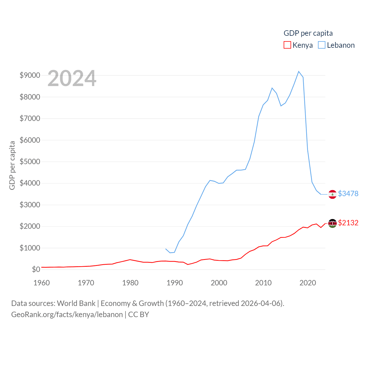 By GDP, Kenya ranks 64/197 ($120B) and Lebanon ranks 128/197 ($20.1B). By GDP per capita, Kenya ranks 154/197 ($2,132), while Lebanon ranks 135/197 ($3,478).