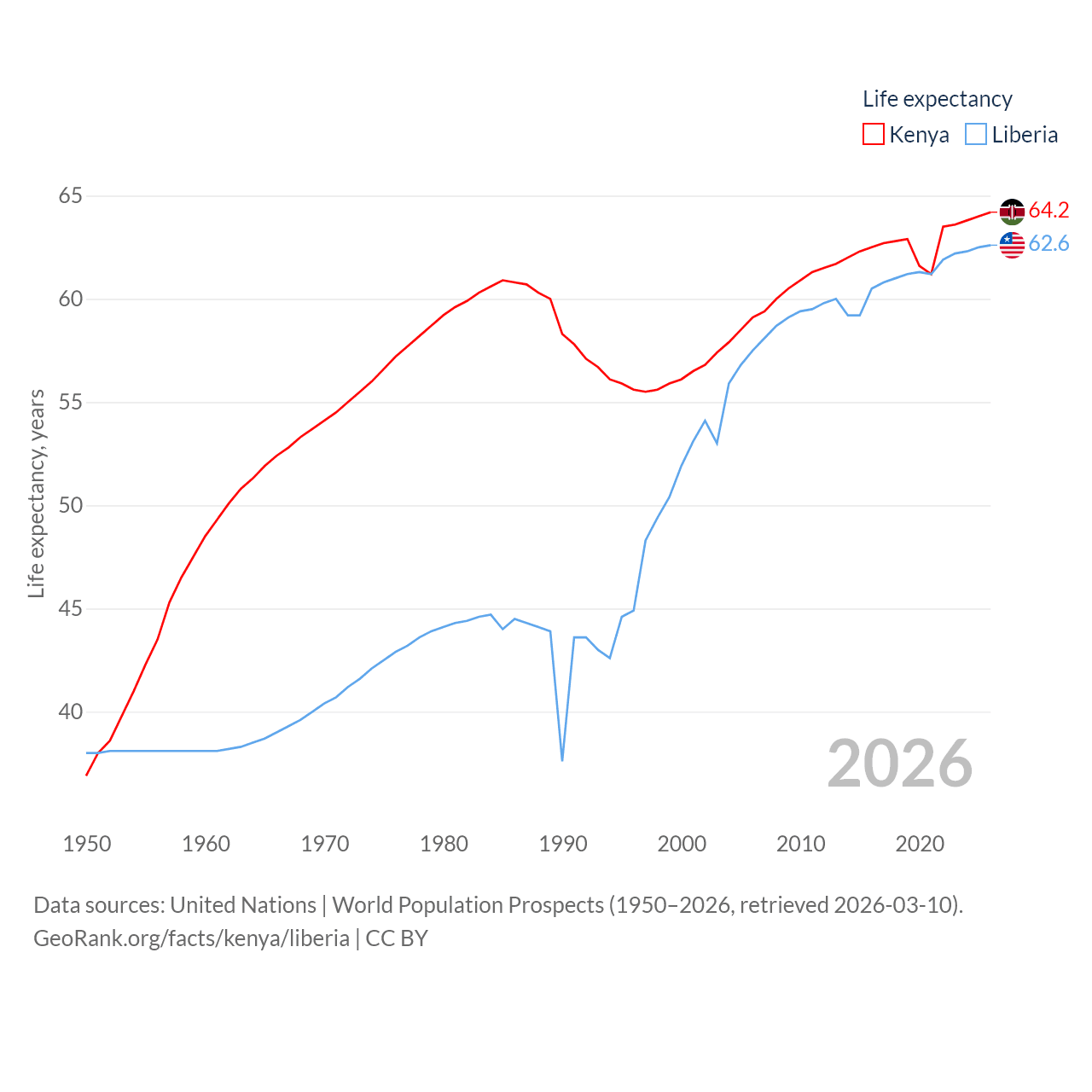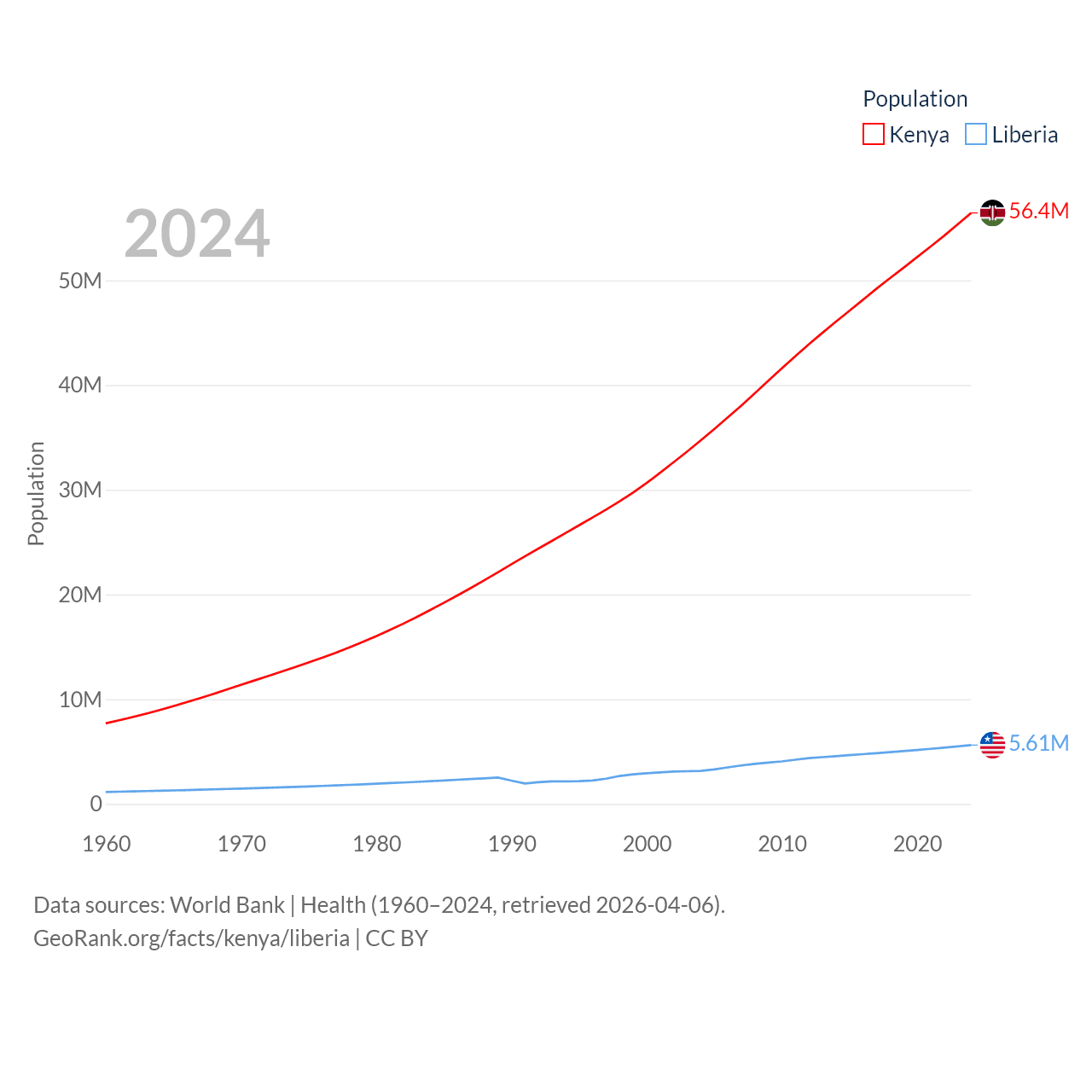 Kenya has a population of 56.4M (ranked 26/197), compared with 5.61M in Liberia (ranked 117/197). Kenya's land area is 224,278 sq mi versus 37,189 sq mi for Liberia (ranked 45th vs. 106th).