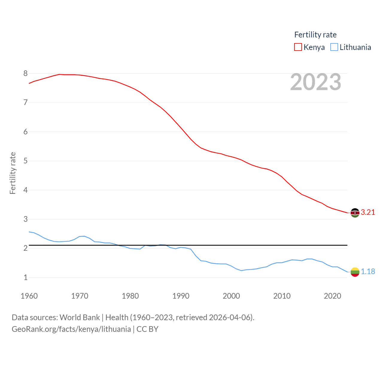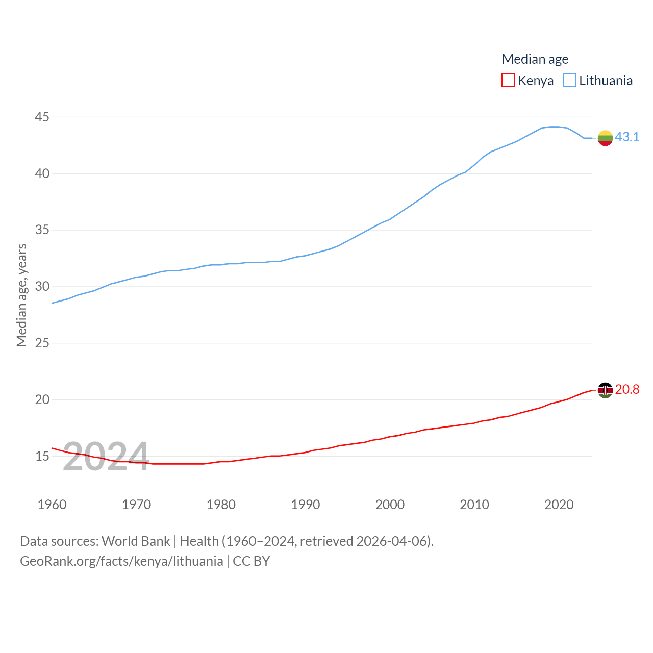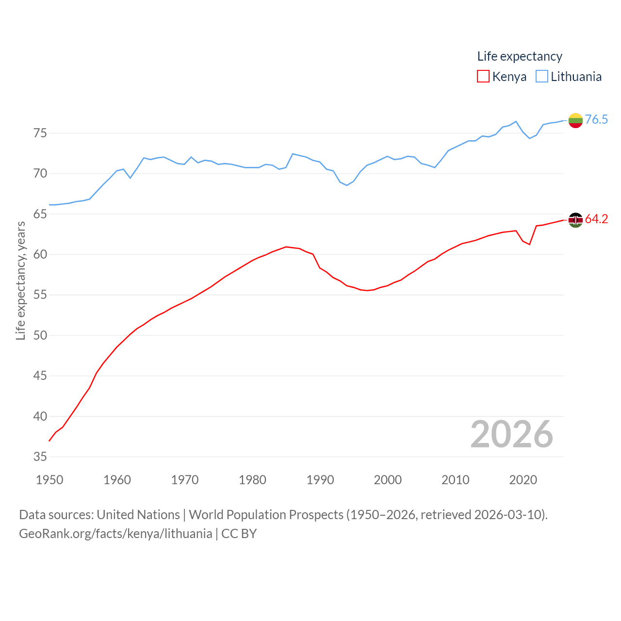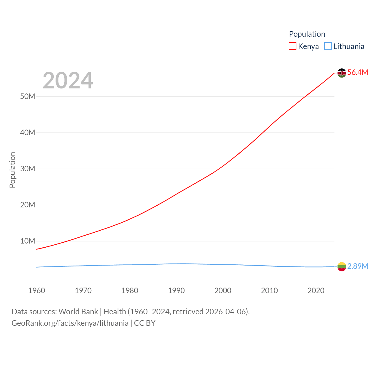 Kenya has a population of 56.4M (ranked 26/197), compared with 2.89M in Lithuania (ranked 137/197). Kenya's land area is 224,278 sq mi versus 24,170 sq mi for Lithuania (ranked 45th vs. 120th).