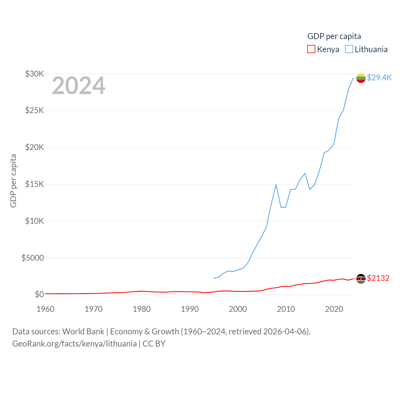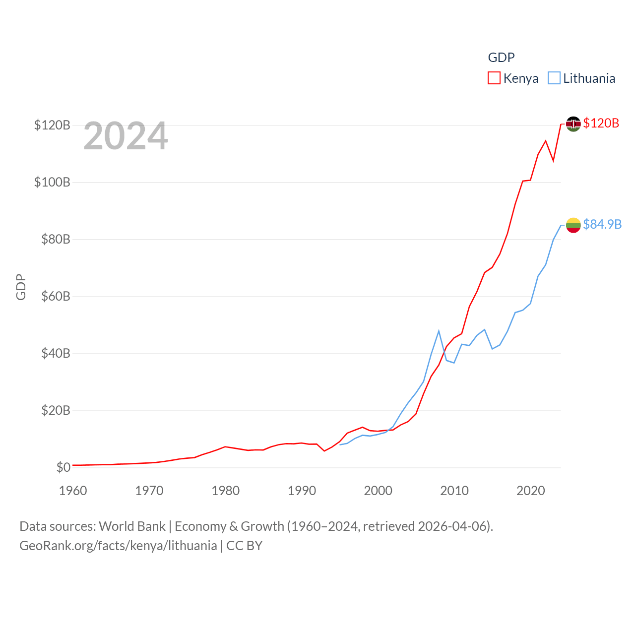 By GDP, Kenya ranks 64/197 ($120B) and Lithuania ranks 79/197 ($84.9B). By GDP per capita, Kenya ranks 154/197 ($2,132), while Lithuania ranks 43/197 ($29,384).