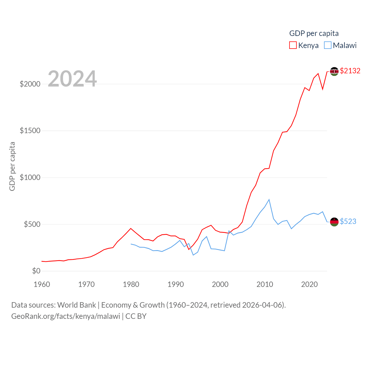 By GDP, Kenya ranks 64/197 ($120B) and Malawi ranks 151/197 ($11.3B). By GDP per capita, Kenya ranks 154/197 ($2,132), while Malawi ranks 194/197 ($523).